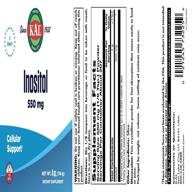 Kal - Inositol 550 mg. - 4 oz. Kal Inositol is a fine crystalline powder with fast absorption that mixes easily in food or juice. Easy-to-mix powder Fast absorption 1 daily About KALInnovation is their tradition; the pursuit of quality is their passion. They believe that you cannot have a quality finished product unless you start with the finest raw materials. KAL products