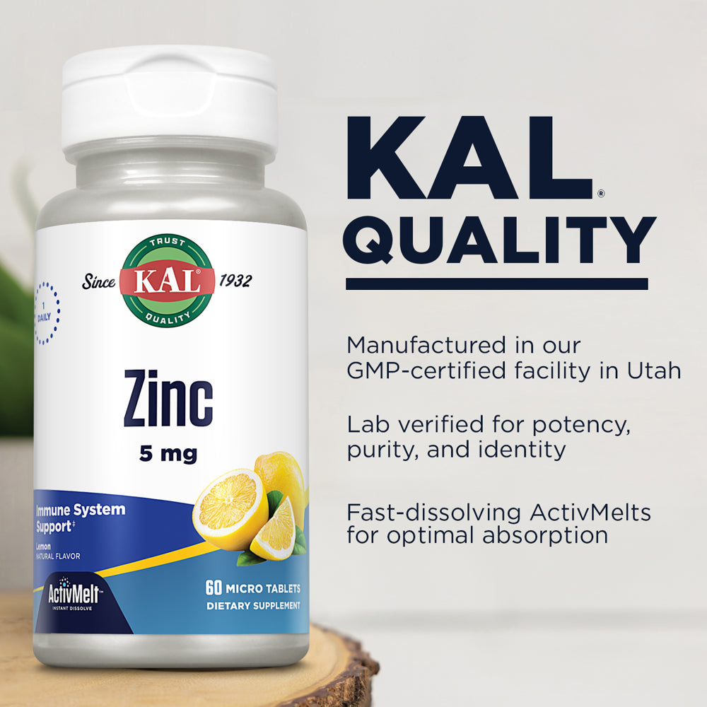 KAL Zinc 5 Mg Activmelt | Sweet Lemon Flavor | Healthy Protein Synthesis, Growth, Taste Acuity & Immune System Function Support | 60 Micro Tablets is backordered and will ship as soon as it is back in stock.