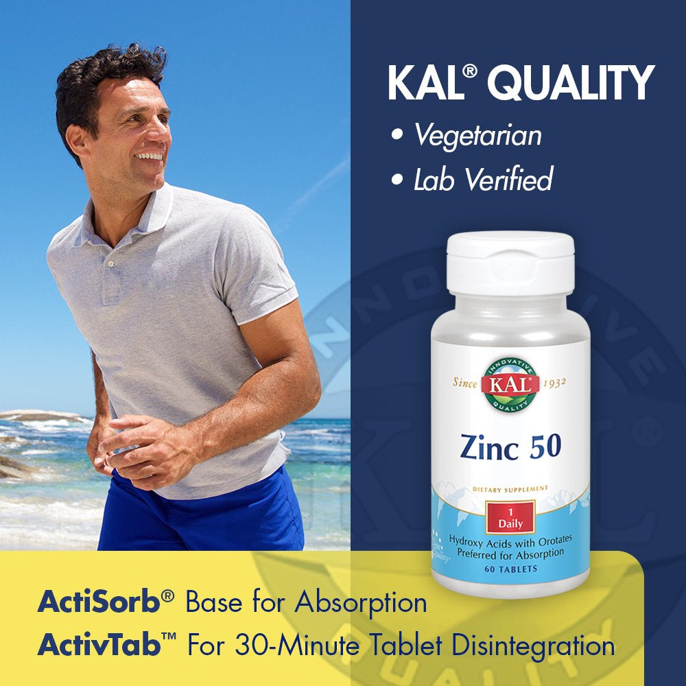 KAL Zinc 50 Hydroxy Acids W/ Orotates | Healthy Metabolism & Immune System Function Support | Preferred for Absorption | Vegetarian | 60 Tablets