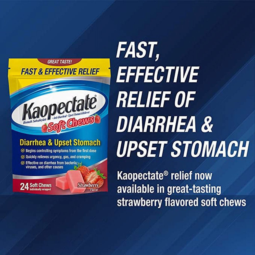 Kaopectate Strawberry Soft Chews 24ct Kaopectate relief now available in great-tasting strawberry flavored soft chews Provides fast & effective relief of diarrhea & upset stomach Begins controlling symptoms from the first dose Quickly relieves urgency, gas, and cramping Effective on diarrhea from bacteria, viruses, and other causes Great tasting, easy to take Kaopectate Strawberry Soft Chews 24ct - Kaopectate relief now available in great-tasting strawberry flavored soft chews - Provides fast & effective relief of diarrhea & upset stomach - Begins controlling symptoms from the first dose - Quickly relieves urgency, gas, and cramping - Effective on diarrhea from bacteria, viruses, and other causes - Great tasting, easy to take