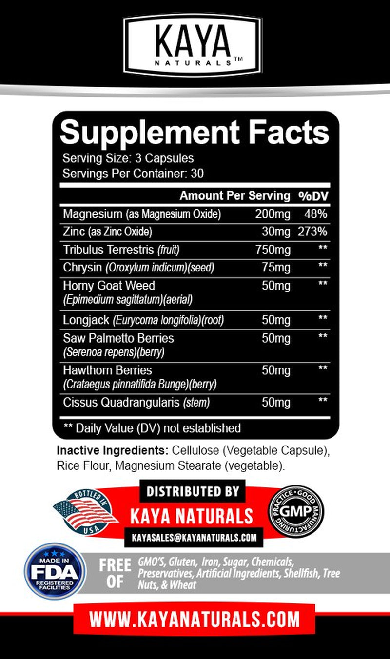 - SAFETY ASSURED AND QUALITY - Kaya Natural's Ultra Testosterone is 3rd-party tested for purity and manufactured in the USA using imported and domestic ingredients in a cGMP compliant facility. Our supplement is made with carefully-selected, premium ingredients, and contains NO: GMO's, soy, gluten, nuts, sugar, chemicals, shellfish, wheat or preservatives.