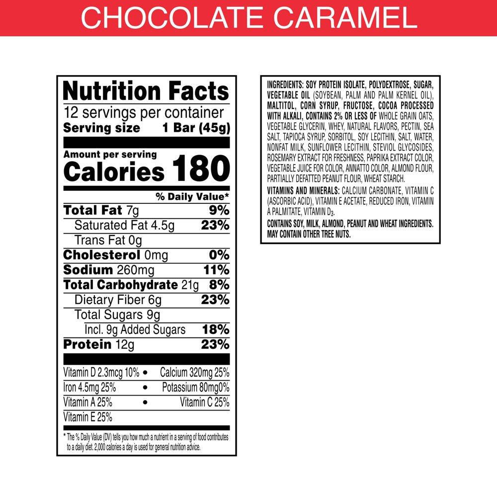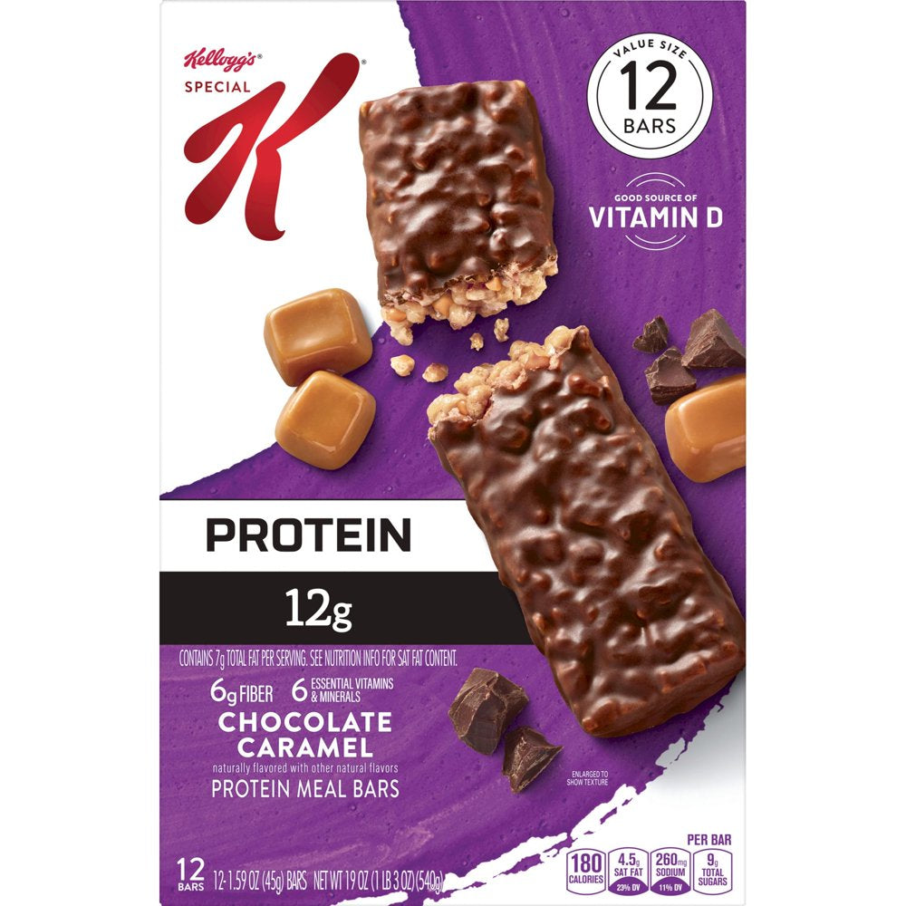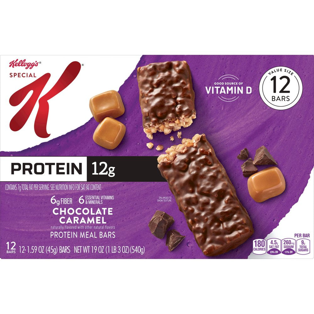 Feed your get-up-and-go with indulgent ingredients that energize and fill you up. These Special K Protein Meal Bars with a rich chocolatey coating and smooth caramel help satisfy the tasty way. Made with no synthetic colors or dyes, each bar has 12g protein (23% daily value, 4.5g saturated fat per serving), plus 6g fiber (7g total fat) and six essential vitamins and minerals. These bars are a great part of any balanced diet; Inspired by your non-stop life, individually wrapped Special K Protein Meal Bars are easy to stash in your work desk, tote, yoga bag, backpack or car. Confidently move through even your busiest days with Special K Chocolate Caramel Protein Meal Bars, the delicious and filling meal replacement or snack that helps keep your routine on track. Shelf-Stable.