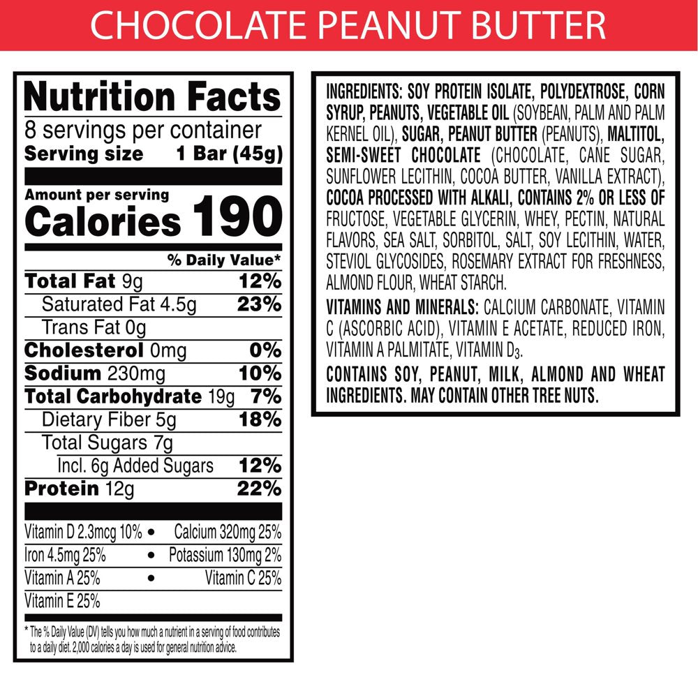 Feed your get up and go with indulgent ingredients that energize and fill you up. Includes 1, 12.7-ounce tray of 8 Special K Chocolate Peanut Butter Protein Meal Bars. Rich chocolatey coating and creamy peanut butter help satisfy the tasty way. Each bar has 12g protein - 22% daily value, plus 5g fiber - 9g total fat, and 6 essential vitamins and minerals, 4.5g saturated fat per serving; these bars are a great part of any balanced diet. Inspired by your non-stop life, individually wrapped Special K protein meal bars are easy to stash in your work desk, tote, yoga bag, backpack or car. Confidently move through even your busiest days with Special K Chocolate Peanut Butter Protein Meal Bars, the delicious and filling meal replacement or breakfast bar that helps keep your routine on track. Shelf-Stable.