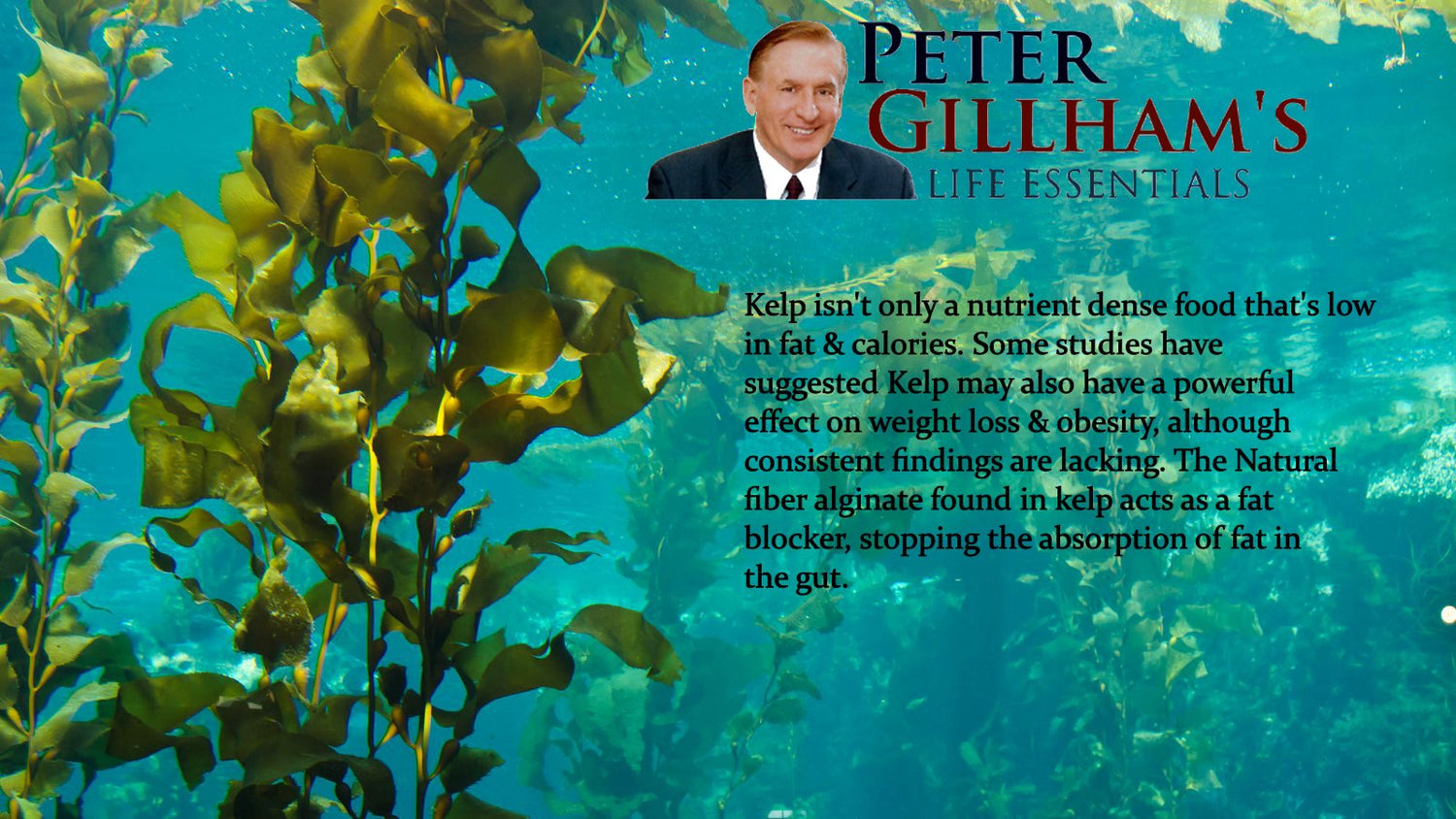 Kelp contains more vitamins and minerals than any other food. It also contains iodine, fiber, protein and "sodium alginate" - a compound that may help remove radioactive particles from the body.Iodine is an antioxidant and helps remove free radicals that accelerate aging. Iodine is required for a healthy thyroid which is a key player in metabolism and hormone balancing.It is often included in weight loss programs.Other possible benefits of kelp include improved digestion, constipation and flatulence relief.