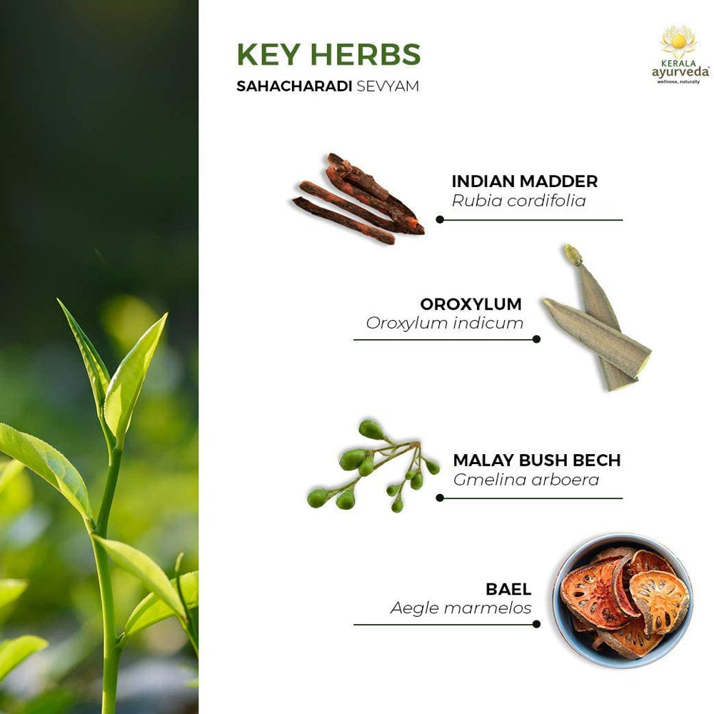 - Sahacharadi Sevyam is an ancient Ayurvedic oil which can be effectively used for pacifying vitiated Vata conditions. This oil helps maintain normal blood flow and supports healthy blood naturally. It is known for supporting healthy colon (Pakvashaya) and balanced elimination (Apana vayu).