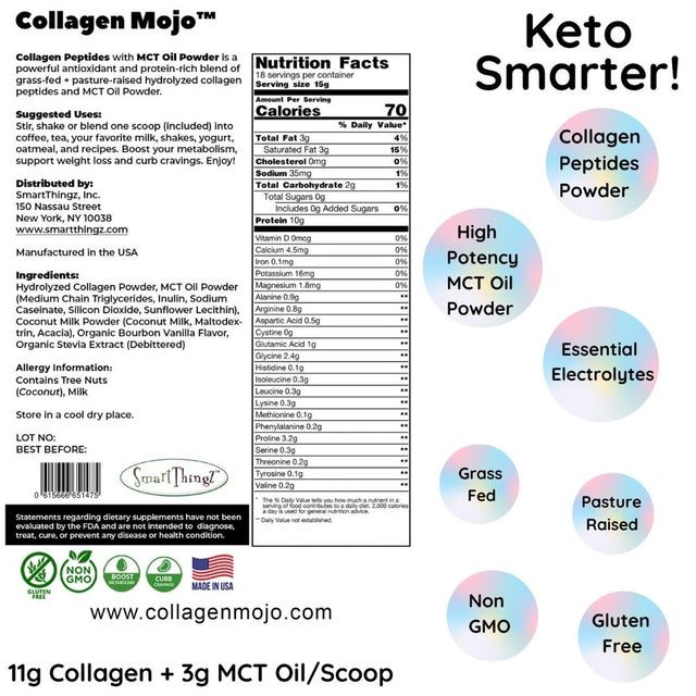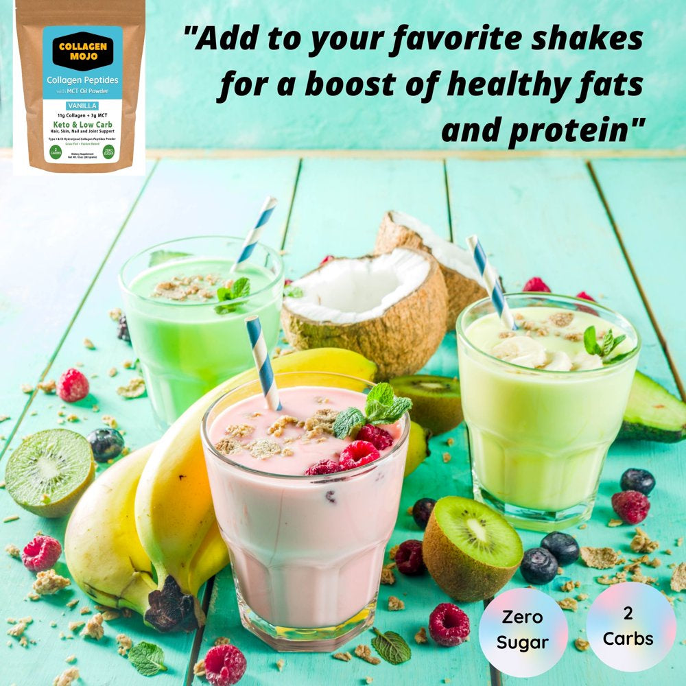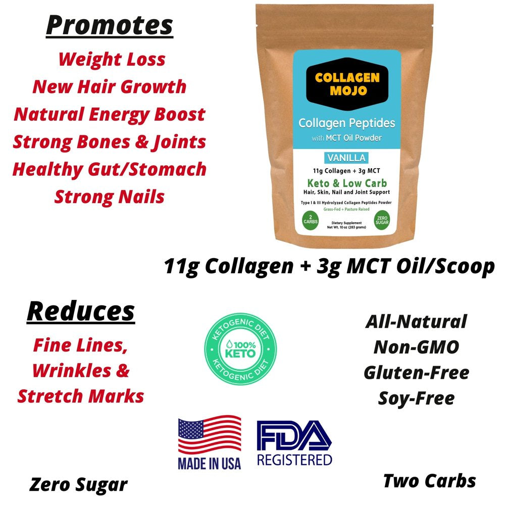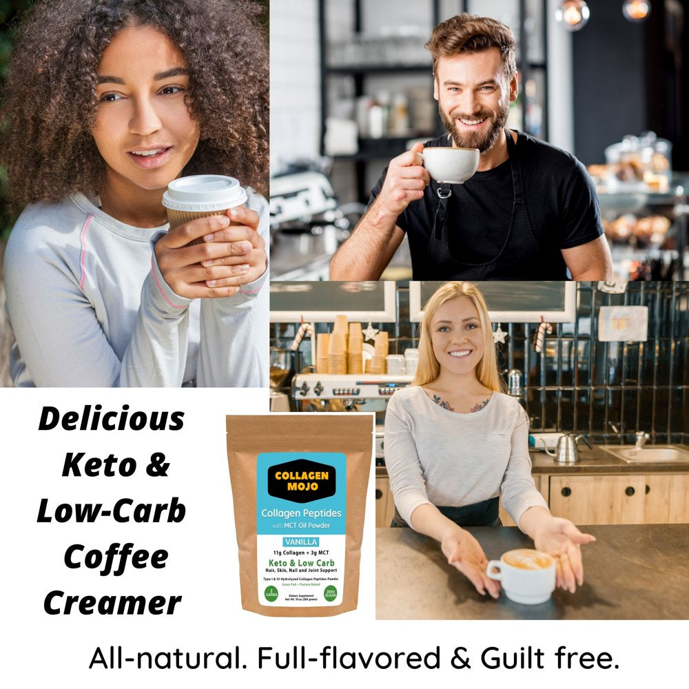 Keto Collagen Mojo Peptides Powder with MCT Oil Powder - As we age we lose collagen. Include hydrolyzed collagen peptides powder with MCT oil in your keto snacks and as a keto collagen creamer for coffee and tea. For a healthy keto breakfast and pre workout, try collagen peptides powder with MCT oil in your keto shakes and as a collagen creamer for coffee. Also enjoy keto Collagen Mojo in yogurt, unsweetened almond milk, oatmeal, and as a keto creamer for coffee. The MCT oil powder keeps you fuller longer. Collagen Mojo and the blend of collagen peptides powder with MCT oil improves joint health and promotes healthier skin, hair and nails. Our hydrolyzed collagen powder is Non-GMO and from grass-fed, pasture-raised bovine. Our MCT oil and collagen peptides powder are used to enhance low carb and keto diets, and are a delicious keto collagen creamer for coffee and pre-workout for women and men. Support joint health and promote anti-aging and new hair growth. Collagen peptides powder contains powerful antioxidants. Reduce cell damage, improve cholesterol levels and prevent chronic disease. Keto Collagen Mojo with it's blend of hydrolyzed collagen peptides powder, electrolytes and MCT oil powder, MCT's are healthy fats that help your body achieve Ketosis and provides a stable boost of energy. Enjoy our chocolate, vanilla, chai and unflavored collagen powder combination as a delicious pre-workout keto creamer for coffee or in low carb keto shakes. The antioxidants in collagen peptides powder and MCT oil offer defense against free radicals. Enjoy as a zero sugar, low carb keto breakfast or share as keto snacks for the office. Collagen helps control blood pressure and improves cholesterol. It's also an anti-inflammatory and helps aid in recovery of muscles. You will love our keto collagen peptides powder as a keto collagen creamer for coffee or add into yogurt, milk and oatmeal for a healthy low carb or keto breakfast. Get your Mojo!
