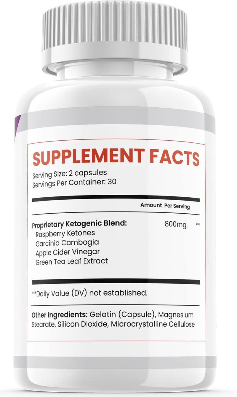 Ingredients:800mg Proprietary Ketogenic Blend: Raspberry Ketones, Gardenia Cambodia, Apple Cider Vinegar, Green Tea Leaf Extract
