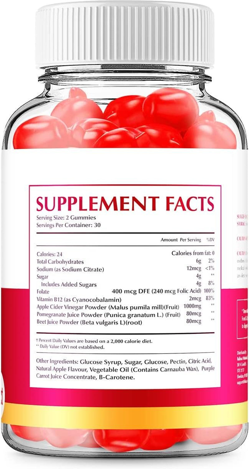 Ingredients: Apple Cider Vinegar, Beet Juice, Beet Root, Pectin, Citric Acid, Folic Acid, Pomegranate, Vitamin B12, Sodium Citrate, Glucose, Sugar, Glucose Syrup, Natural Apple Flavor, Vegetable Oil, Carrot Concentrate, Beta Carotene, Carnuba Wax