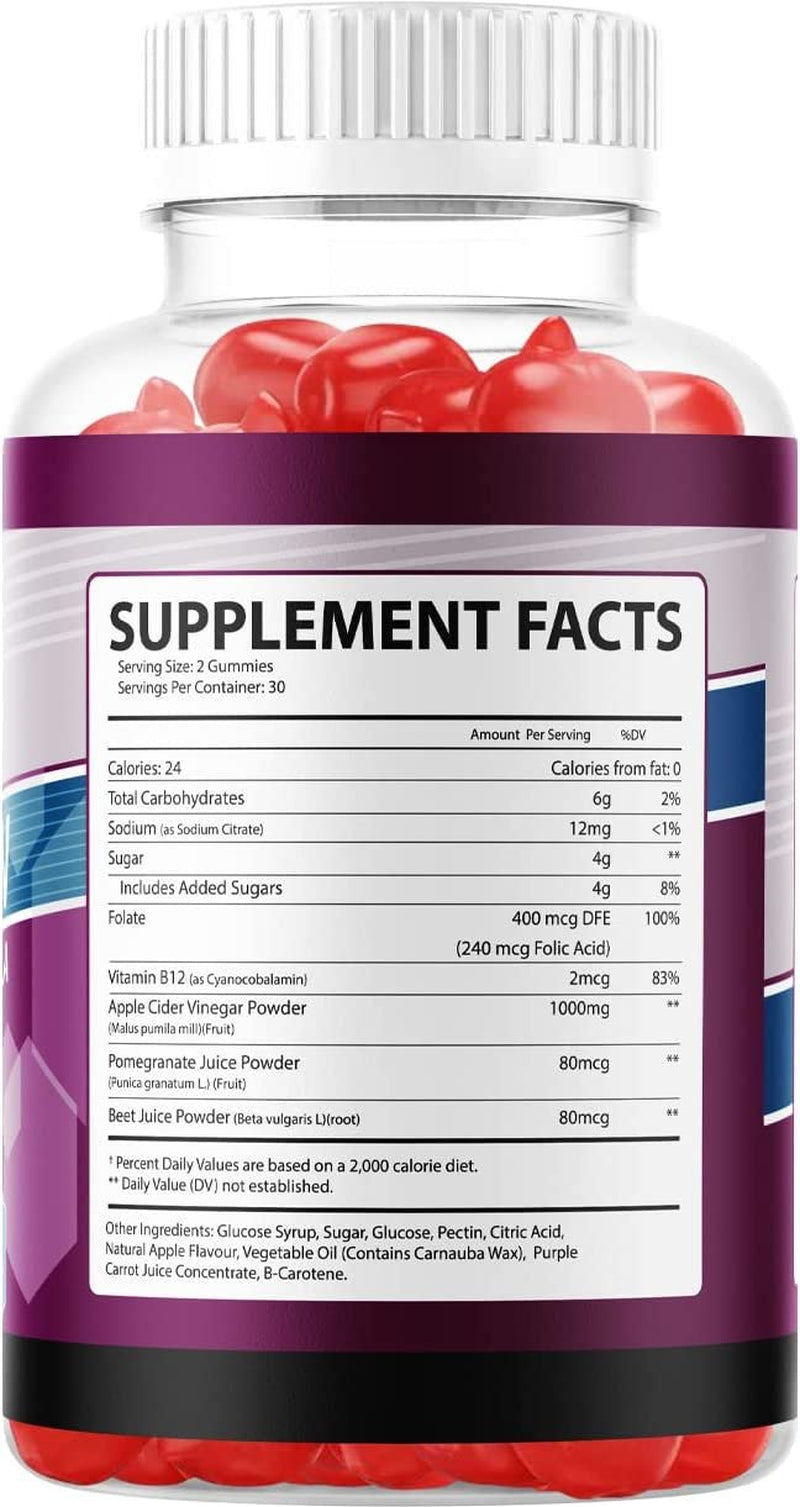 Ingredients:Apple Cider Vinegar, Beet Juice, Beet Root, Pectin, Citric Acid, Folic Acid, Pomegranate, Vitamin B12, Sodium Citrate, Glucose, Sugar, Glucose Syrup, Natural Apple Flavor, Vegetable Oil, Carrot Concentrate, Beta Carotene, Carnuba Wax