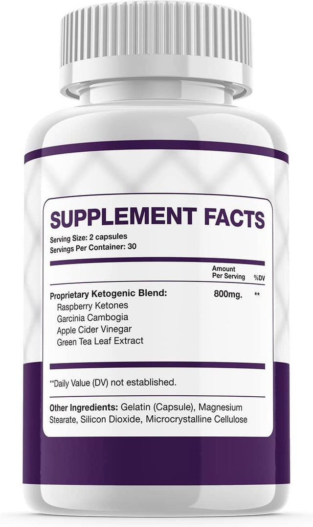 Ingredients:800mg Proprietary Ketogenic Blend: Raspberry Ketones, Gardenia Cambodia, Apple Cider Vinegar, Green Tea Leaf Extract