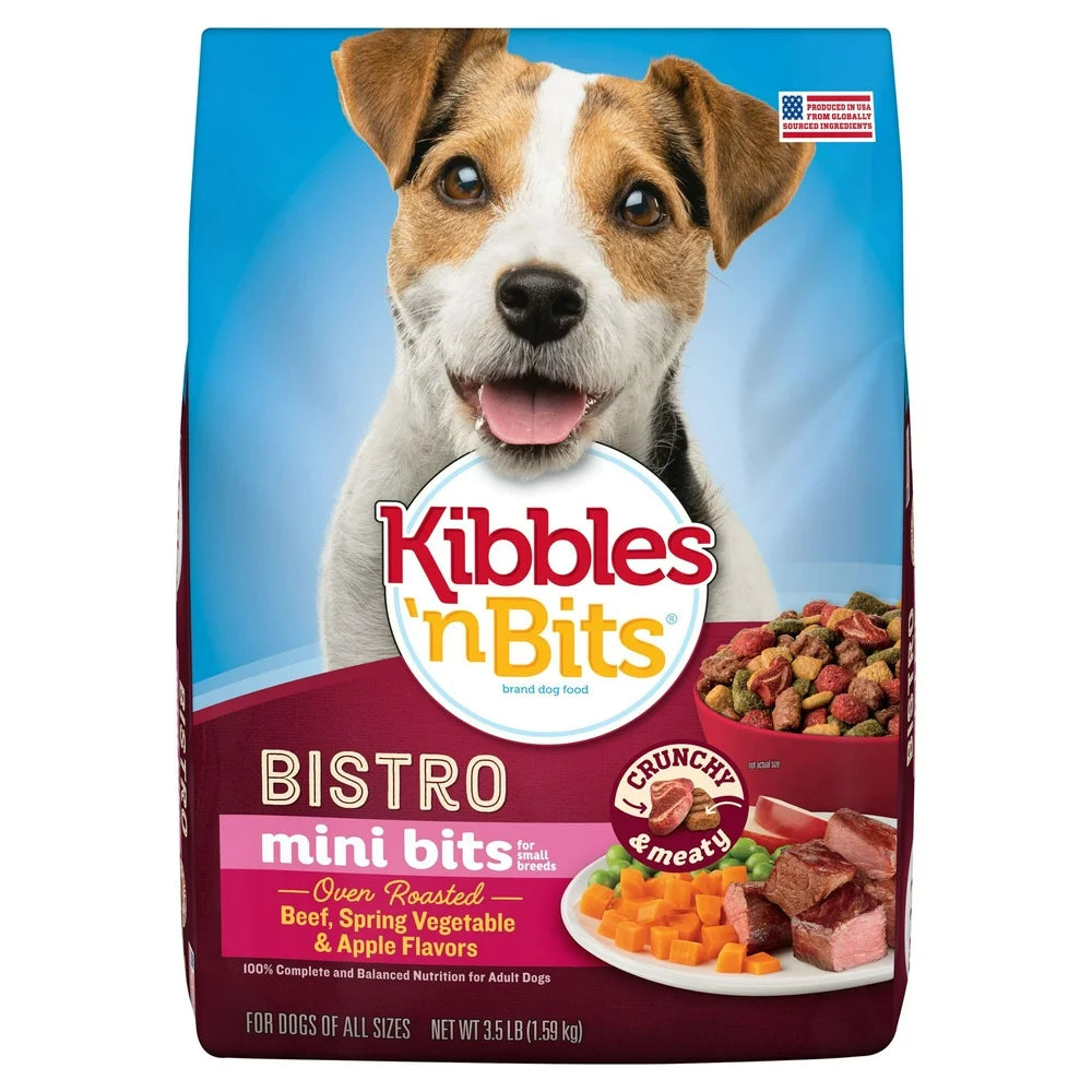 - Contains one (1) 3.5-pound bag of Kibbles 'n Bits Bistro Mini Bits dry dog food for small breed dogs