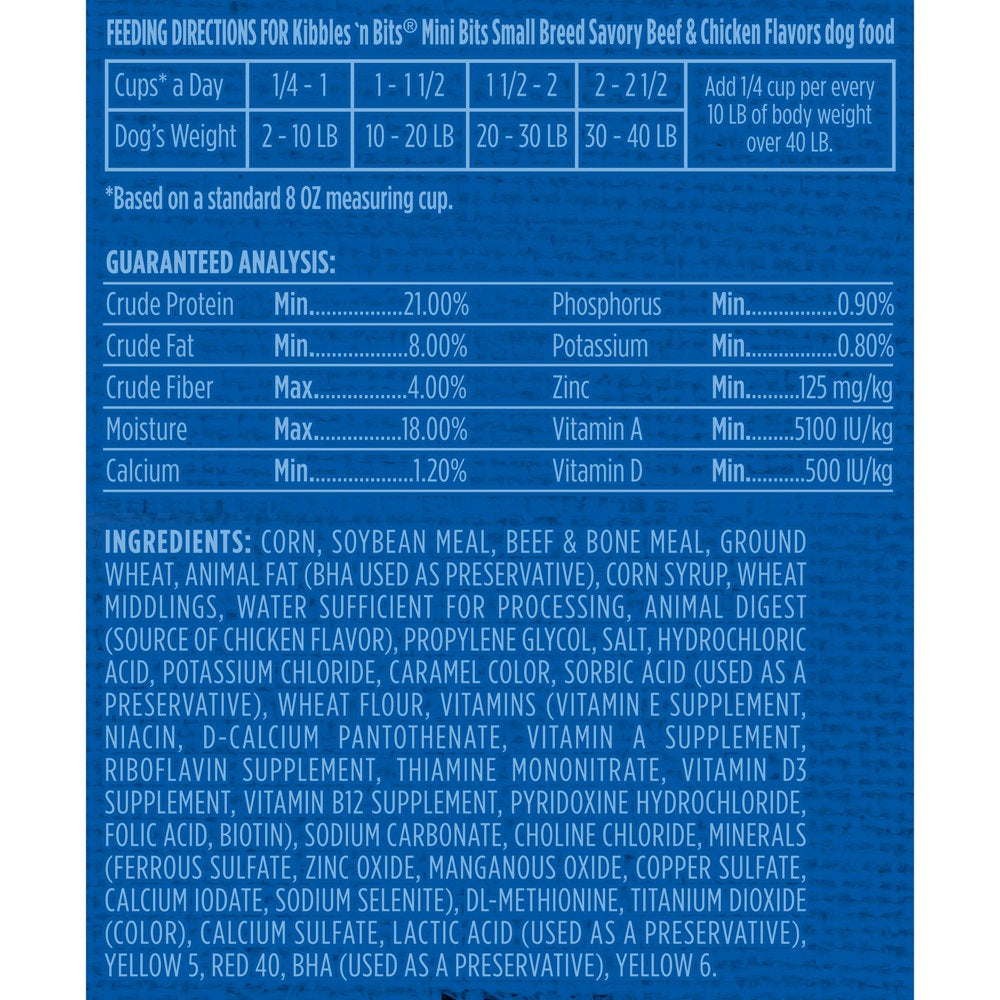- Contains one (1) 16 pound bag of Kibbles 'n Bits Mini Bites Small Breed Savory Beef and Chicken Flavors Dog Food