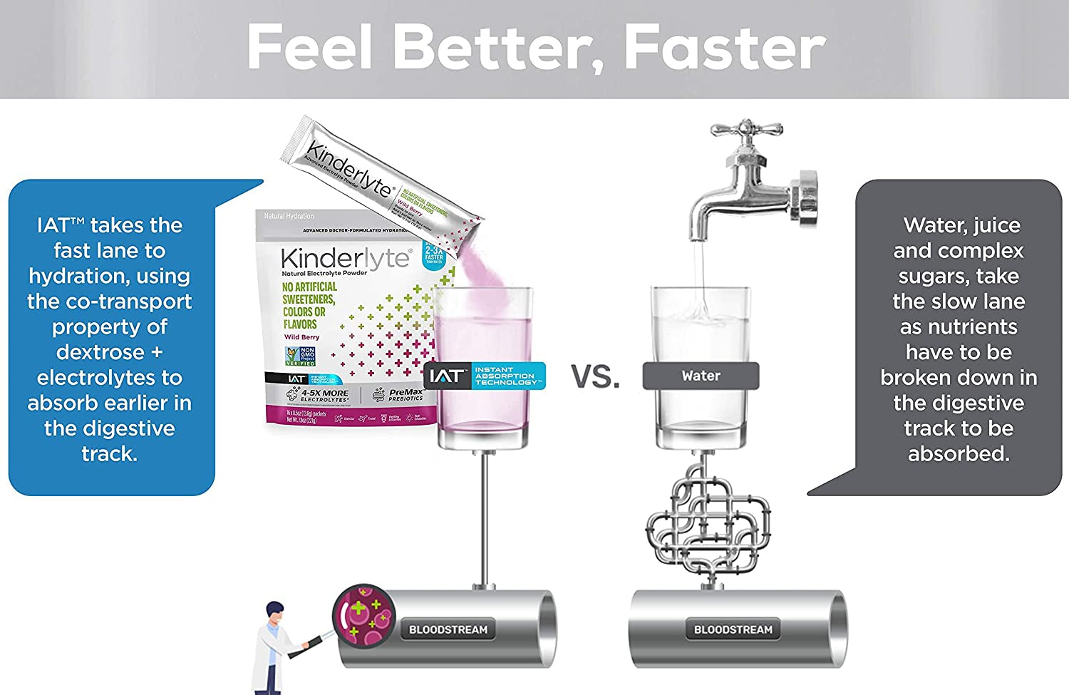 - STOMACH BUG, TRAVEL, LATE NIGHTS OH MY! - Formulated with doctors to be both delicious and effective, Kinderlyte delivers rapid hydration to people of any age. It works fast to address dehydration for any reason including upset stomach, heat exhaustion, sports, late nights, travel and more!