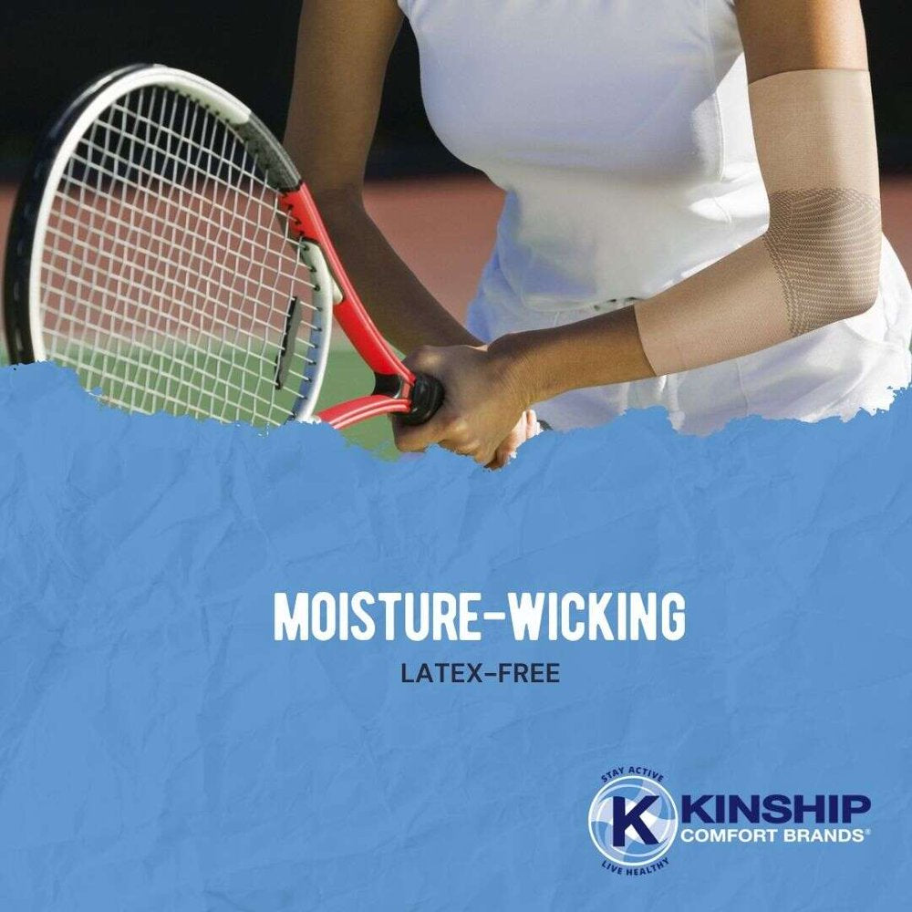 Engineered firm compression elbow sleeves support with added benefits of controlling swelling and providing arthritis and bursitis treatment relief, 80% Nylon, 20% Spandex blend assures a comfortable fit for all-day comfort. Machine wash, dry on low heat, or hang dry. Your sleeve should fit snuggly but not so tight that it restricts blood flow to the hands and fingers. Our elbow compression sleeve is a good solution for tendinitis, bursitis, and other ailments requiring elbow support for pain relief. The Kinship Comfort Brands elbow brace can be used as a tennis elbow brace women and is an option as an elbow sleeve weightlifting. If you work out, use our elbow sleeves weight lifting for elbow support in the gym. Men and Women Golfers can use our compression brace as a golf elbow sleeve. Use our carpal tunnel elbow brace for tendonitis when working as a tradesperson such as electricians, plumbers, HVAC techs, and anyone who needs an elbow compression sleeve to support their elbows during heavy lifting. Our compression brace is an alternative to elbow straps, elbow bands, forearm straps and elbow compression bands. For pain relief, elbow support and forearm support try our Kinship Comfort Brands elbow compression sleeve.