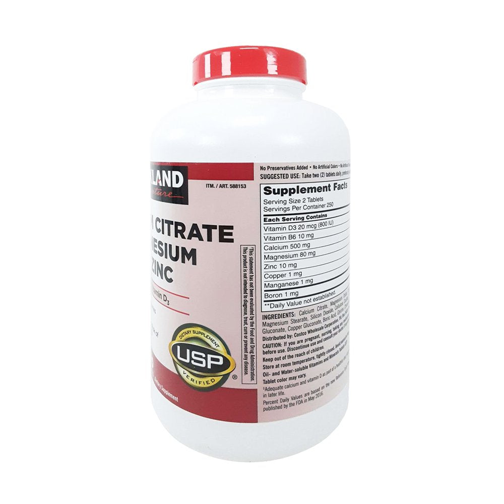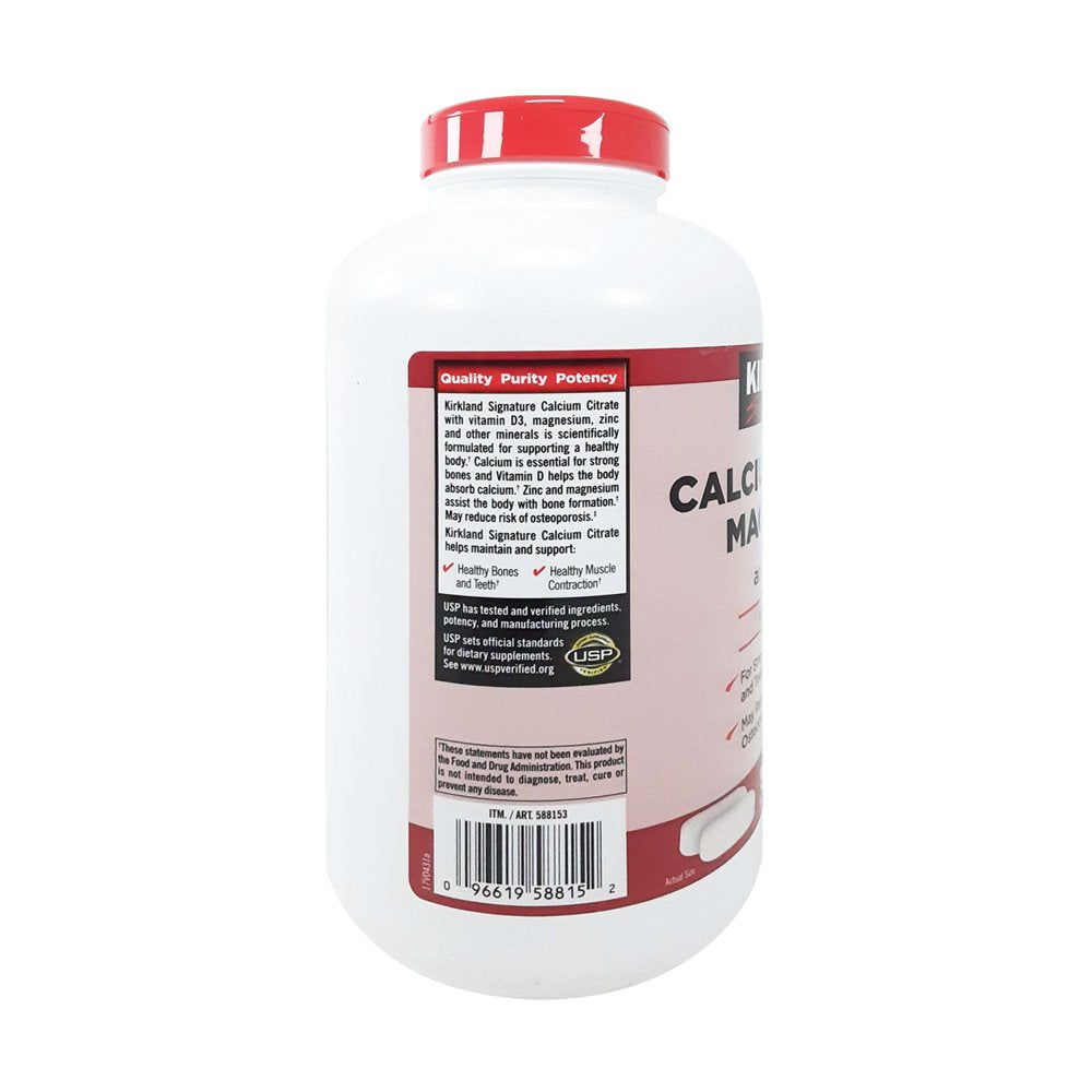 Your Complete Calcium Formula Get the benefits of three essential minerals and Vitamin D3 working together to support bone health.† Learn More about Kirkland Signature™ Calcium Citrate Click "View More Details" below. Kirkland Signature Calcium Citrate, Magnesium & Zinc is formulated for building a healthy body.† Calcium is essential for strong bones and Vitamin D3 helps the body absorb calcium.† Zinc and Magnesium assist the body with bone formation.† Helps maintain healthy bones and teeth.† Supports healthy muscle contraction.† Reduces risk of osteoporosis.◊ Calcium Citrate - 500 mg Magnesium – 80 mg Vitamin D3 – 20 mcg (800 IU) Zinc – 10 mg Kirkland Signature Calcium Citrate Magnesium and Zinc, 500 Tablets