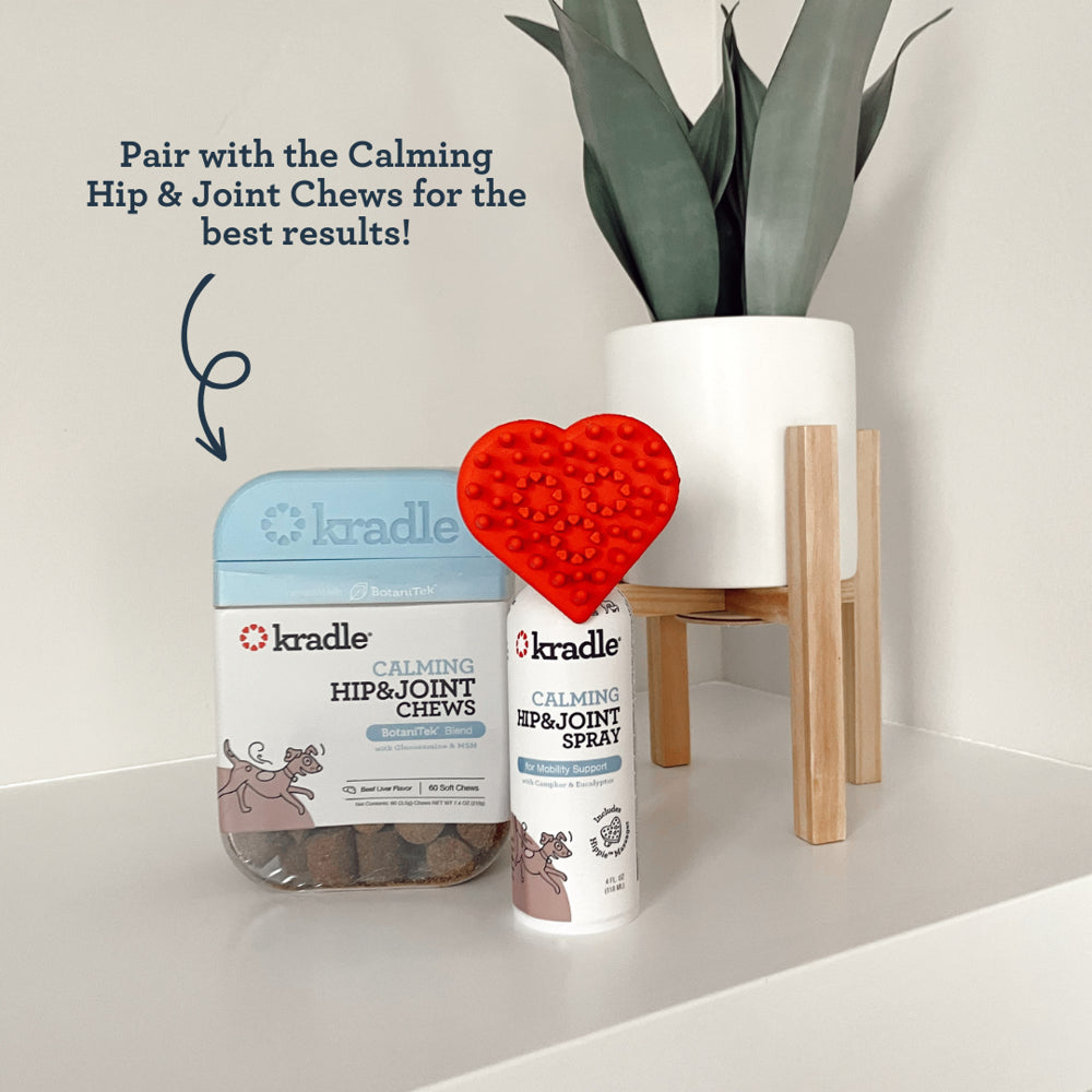 Kradle Calming Hip & Joint Spray with Hippie Applicator, Dog Mobility Support, 4 fl oz. Soothing spray that promotes mobility and flexibility for hip & joint health. The Kradle Calming Hip & Joint spray uses natural ingredients to enhance joint functions, support flexibility, and calm your dog.