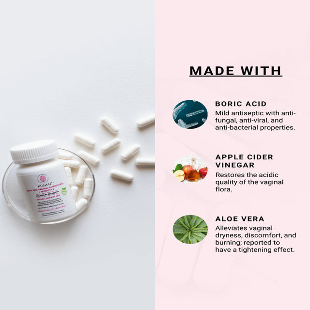 - The perfect blend of boric acid, soothing organic aloe vera, apple cider vinegar, and probiotics for maximum effectiveness.