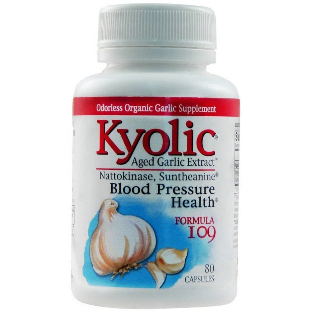 Kyolic Formula 109 Aged Garlic Extract Blood Pressure Health Kyolic Aged Garlic Extract begins with 100% organically grown garlic bulbs. Aged Garlic Extract 200 mg; Nattokinase (NSK-SD) 35 mg; Suntheanine (L-Theanine) 12 mg (per capsule). Kyolic Formula 109 contains a unique and natural combination of Nattokinase and Suntheanine with Aged Garlic Extract to help relax and support healthy blood pressure through different pathways. Clinical studies have shown these ingredients can help support healthy blood pressure levels.