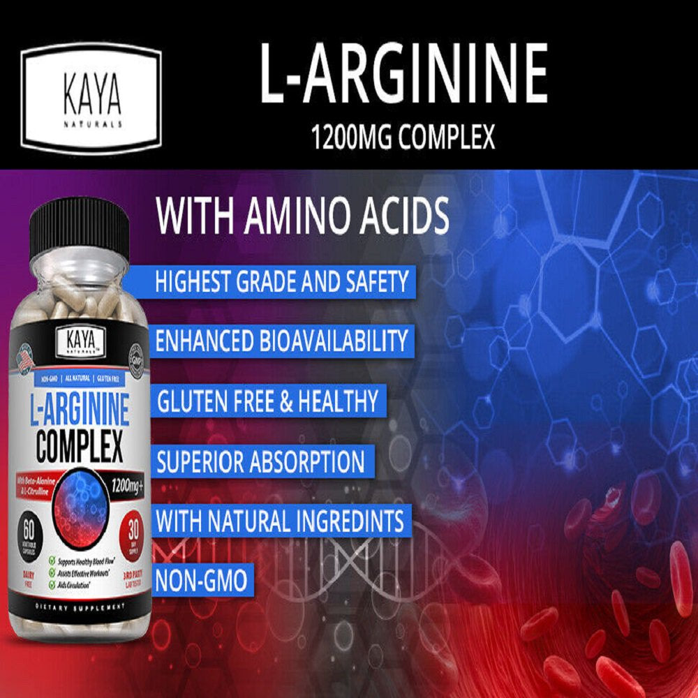 Kaya Naturals offers a high potency 1200mg L-Arginine Complex. Our unique formula has been shown to aid in improving ED for men, help lower blood pressure, and improve cardiovascular health. L-Arginine helps your body maintain healthy blood flow by encouraging the widening of blood vessel walls to support better blood flow to various parts of the body. Some studies show improved circulation in pregnant women. L-Arginine has been shown to increase the stamina, confidence, and improved circulation needed to perform better physically both in and out of the bedroom. If you need a high-quality, high-potency L-Arginine supplement, our premium blend capsules promote healthy endurance levels as well as stamina, circulation, and heart health. Kaya Naturals L-Arginine Complex is 3rd-party tested for purity and manufactured in the USA using imported and domestic ingredients in a cGMP compliant facility. It is great for women and men.