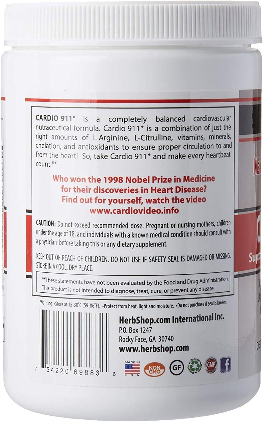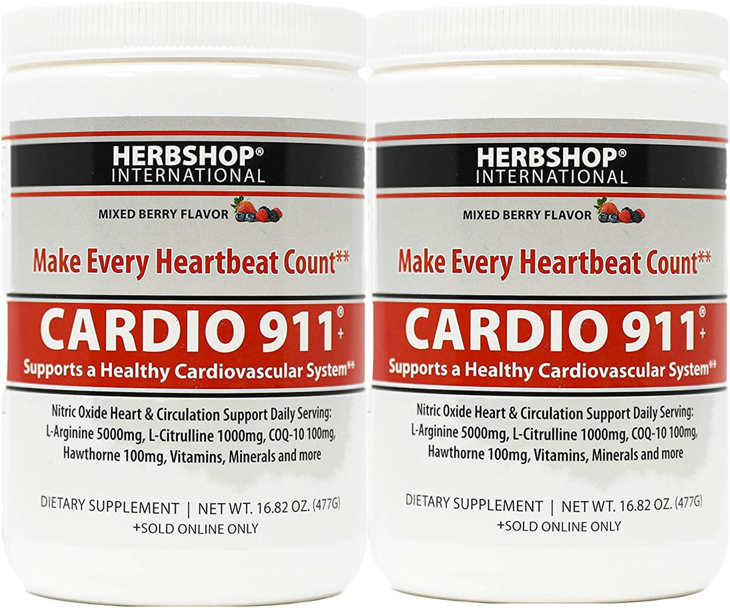 Herbshop International presents Cardio 911 A L-Arginine powder Supplement packed with Vitamins and Minerals to Support Healthy Blood Flow & Energy Levels, Blood Pressure Support & Cholesterol Support. Great for Cardio Fitness, Pre-Workout, Energy and Circulation. A Non-GMO, Vegetarian, Gluten Free & Dairy Free. CARDIO 911 come in TWO great flavors, Mixed Berry and Tart Cherry.