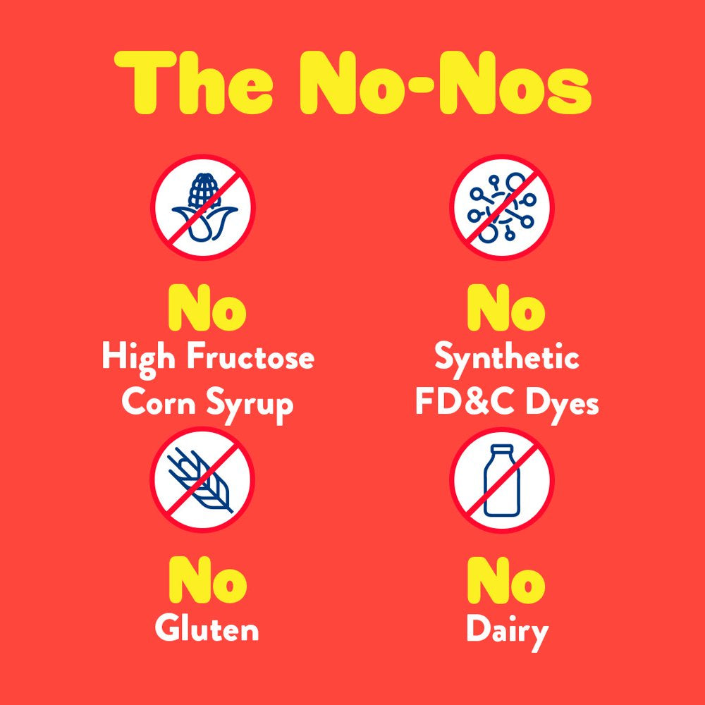• Contains no high-fructose corn syrup, no synthetic (FD&C) dyes, no dairy and no gluten.