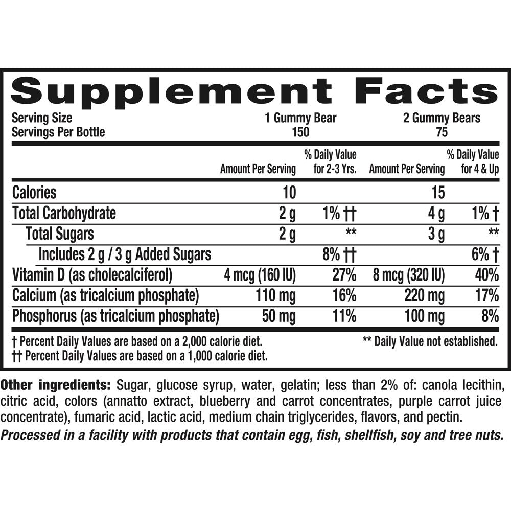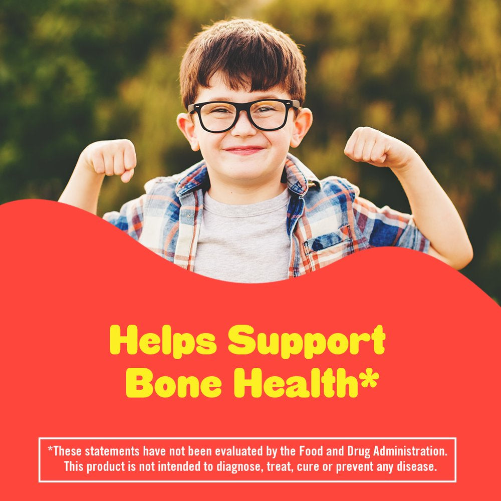 • One serving of Children’s calcium supplement provides is a good source of calcium and an excellent source of Vitamin D3 to support bones, growth & development. 2 Calcium + D3 gummies contain as much calcium as a 5 oz. glass of milk. *