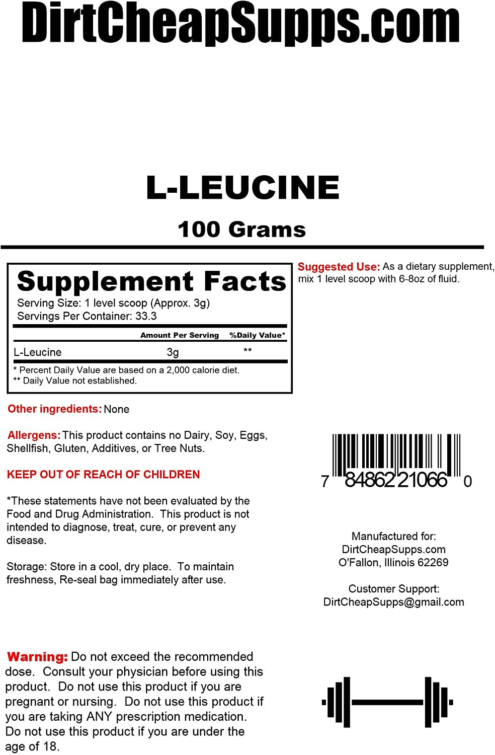 L-Leucine is an essential amino acid that is used in the biosynthesis of protein. L-Leucine may help with the maintenance of muscle mass while dieting as well as enhance muscle growth after strenuous exercise. L-Leucine is arguably the most important of the BCAAs. L-Leucine Powder is an excellent ingredient to add to your sport supplement arsenal.* DirtCheapSupps L-Leucine Powder is free of any binders or anti-caking agents. What you get is exactly what you are paying for...only the finest raw material without the fluff. Trust DirtCheapSupps for all of your supplement raw material needs. Every raw material is thoroughly tested utilizing both HPLC testing and FTIR analysis to determine both purity and potency. COA's are available upon request. *NOTE: These statements have not been evaluated by the Food and Drug Administration. This product is not intended to diagnose, treat, cure, or prevent any disease. Store this raw material in a cool and dark place. Keep away from children.