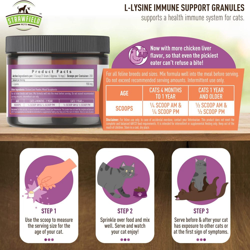 L-LYSINE FOR CATS SUPPLEMENT POWDER - 900 mg of l-lysine hydrochloride per scoop, natural chicken liver flavor for picky eaters. Safe for kittens, adults & senior cats of all breeds. Sprinkle l-lysine immune system support supplements over cat food once per day.,CAT IMMUNE SUPPORT SUPPLEMENT - Our best l-lysine cats supplement powder works as a pet immune system booster without the use of cat meds or antibiotics. Helps treat feline herpes, herpesvirus, cough, cat sneezing, runny nose, congestion, colds.,CAT RESPIRATORY SUPPORT - Our powerful cat vitamins and supplements contain 2x more cat lysine supplement amino acids per scoop for optimal cat health. L-Lysine powder for cats is a natural upper respiratory infections treatment for cats & kittens & a cat cold medicine decongestant.,BEST EYE HEALTH SUPPLEMENTS - Our l-lysine for cats helps to prevent & treat cat eye infections & works great for kitten eye infection treatment.,100% MADE IN THE USA - Strawfield Pets l-lysine for cats product is independently lab tested for safety. Our powdered l-lysine supplement is crafted with pure & natural ingredients for premium quality you can trust.
