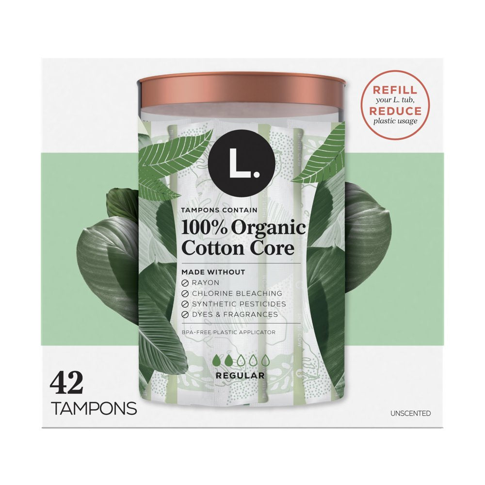L. believes access to period care is a fundamental right for everybody. By supporting local organizations who make and donate pads, increase education, create access to opportunity and work to reduce menstruation taboos, L. strengthens its collective action for lasting change. Love begins with L. 100% Organic cotton core. Organic tampons free of chlorine bleaching, pesticides, rayon, fragrances, or dyes. A grip that helps prevent the slip. Regular, Fragrance-Free, 42 count, 0.62 lb