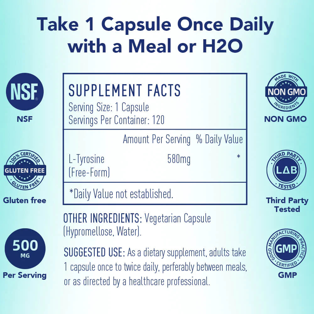 - The hypoallergenic Tyrosine Dietary Supplement supplies 500 mg of L-tyrosine USP per vegetarian capsule.