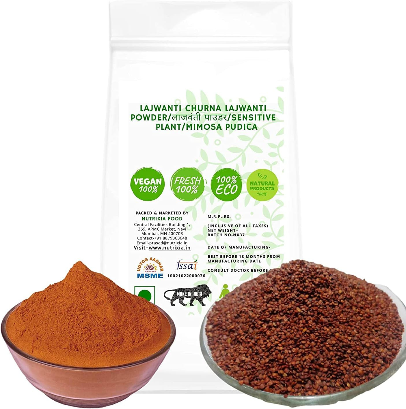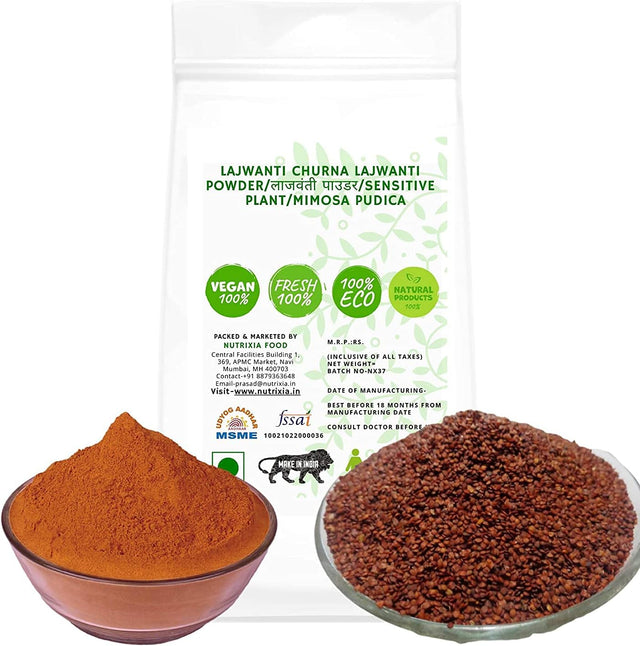 Other Names- Lajwanti Churna Lajwanti Powder / लाजवंती पाउडर / Sensitive Plant / Mimosa pudica Packaging- We believe in transparency and our packaging reflects It. Our products are packed in good quality transparent standing plastic pouch with zip lock which can be reusable. Storage Instructions: Please reseal the packet after every use. Keep away from moisture and direct sunlight. Use the contents within 3 months of opening.and 12 months from date of packing. About US Nutrixia Food is retailer and wholesaler of good quality Spices, Herbs, Ayurvedic products, Cereals, Oilseeds, Dry fruits, Essential oils and Grocery items. Root is useful in asthma, cough and scrofulous affections. It is given in fever and is useful in sinusitis. The root is one of the five ingredients of Brahata panchamool and has a large