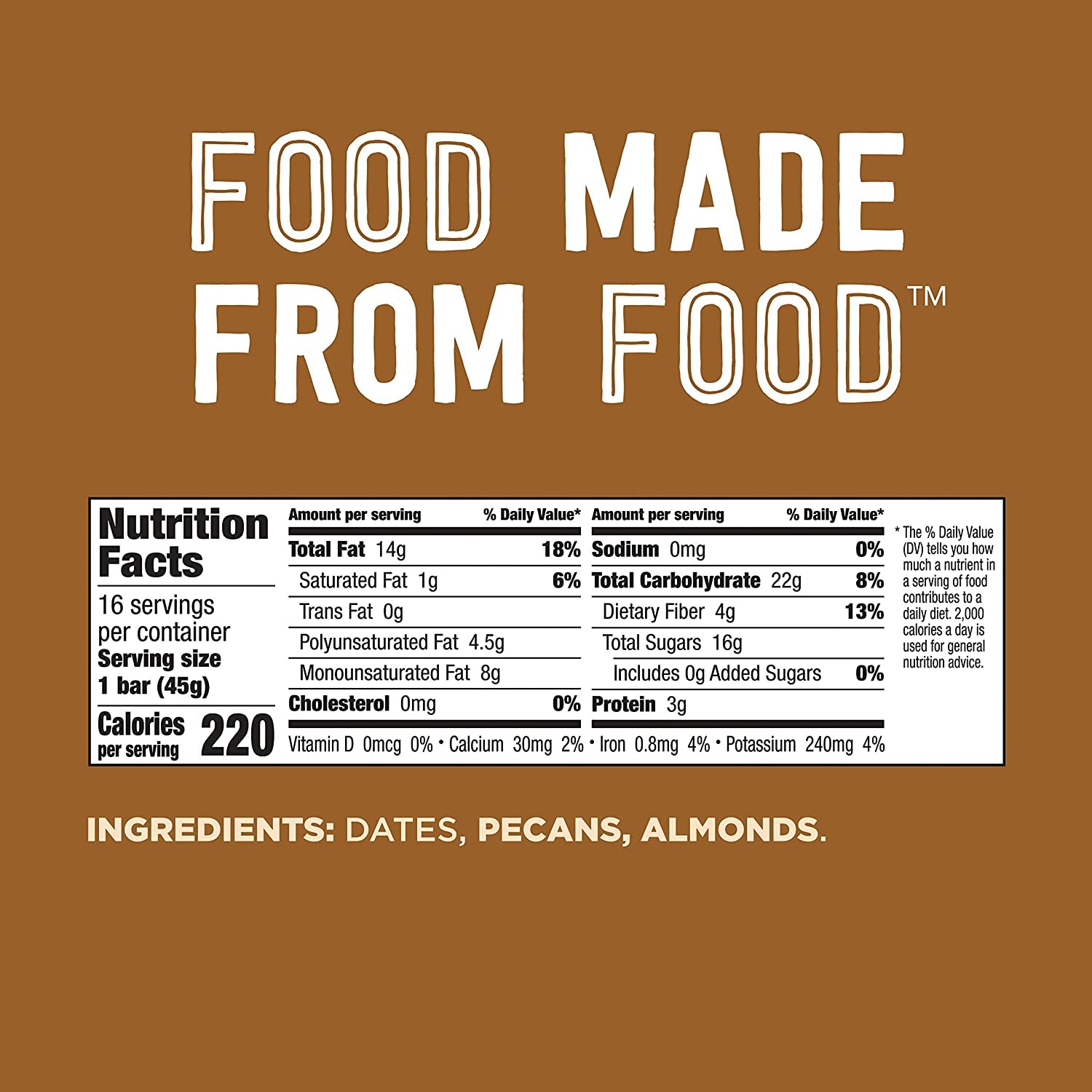 - Pecan Pie flavor made with just 3 ingredients - dates, pecans and almonds; Cashew Cookie flavor made with just 2 ingredients - cashews and dates (Larabar)