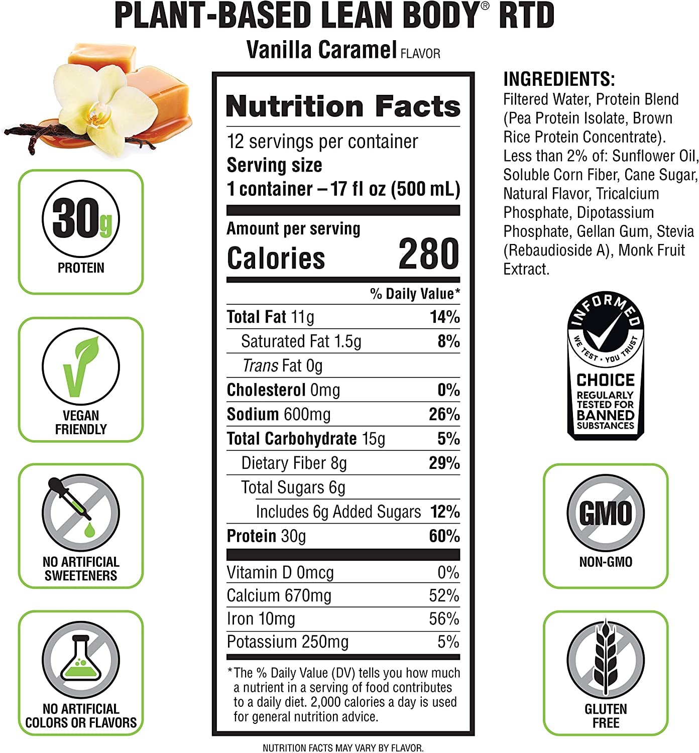 Lean Body Ready-To-Drink, Plant-Based Vegan Vanilla Caramel Protein Shake, 30G Protein, No Artificial Flavors, Sweeteners or Colors, Non GMO, Gluten Free, Premium Pea & Rice Blend (Pack of 12) - Plant Vanilla Caramel / 17 Fl Oz (Pack Of 12) is backordered and will ship as soon as it is back in stock.