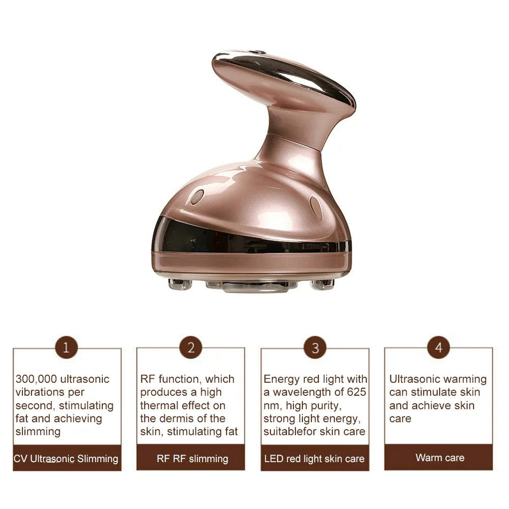 300,000 times/second Ultrasonic High Frequency Vibration: waking up the cells inside your skin, improving the function of cellular metabolism, accelerating decomposition of cellulite and eliminating lymph nodes.