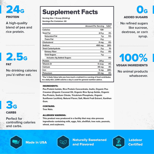 - 100% VEGAN PROTEIN POWDER. Plant+ is a sweetened and flavored blend of pea protein powder and rice protein with 25 grams of protein per serving and little carbohydrate and fat.