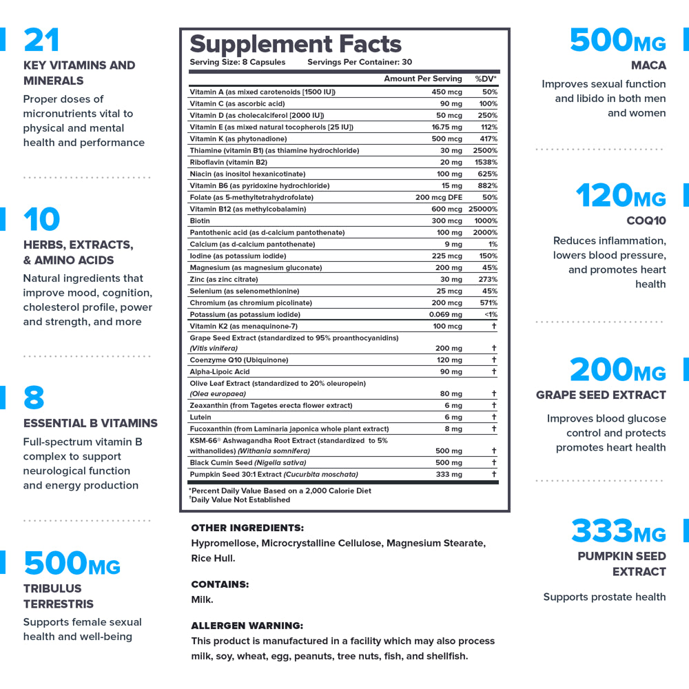 - DAILY MULTIVITAMIN FOR MEN. With 21 vitamins and minerals and 11 powerful phytonutrients.BOOST YOUR IMMUNE SYSTEM. A potent vitamin and mineral and herb formulation for immune support.WORKOUT VITAMINS THAT REALLY WORK. More energy, less stress, improved performance, & better recovery.EFFECTIVE VITAMINS FOR ANXIETY. One of the few multivitamins that can reduce anxiety and depression.