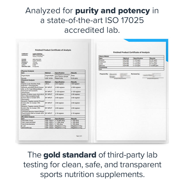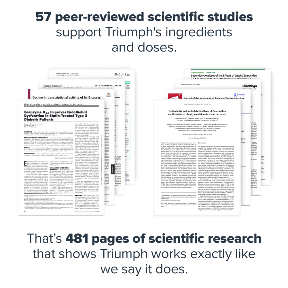 Triumph is a 100% natural sport multivitamin that enhances health, performance, and mood, and reduces stress, fatigue, and anxiety. 57 peer-reviewed scientific studies support Triumph’s combination of ingredients and doses That’s 481 pages of scientific research that shows Triumph works exactly like we say it does. Contains no artificial fillers, food dyes, or other chemical junk While these types of chemicals may not be as dangerous as some people claim, studies suggest that regular consumption of them may indeed be harmful to our health. And that’s why you won’t find them in Triumph. Analyzed for purity and potency in a state-of-the-art ISO 17025 accredited lab Every bottle of Triumph from Legion Athletics is guaranteed to provide exactly what the label claims and nothing else—no heavy metals, microbes, allergens, or other contaminants.