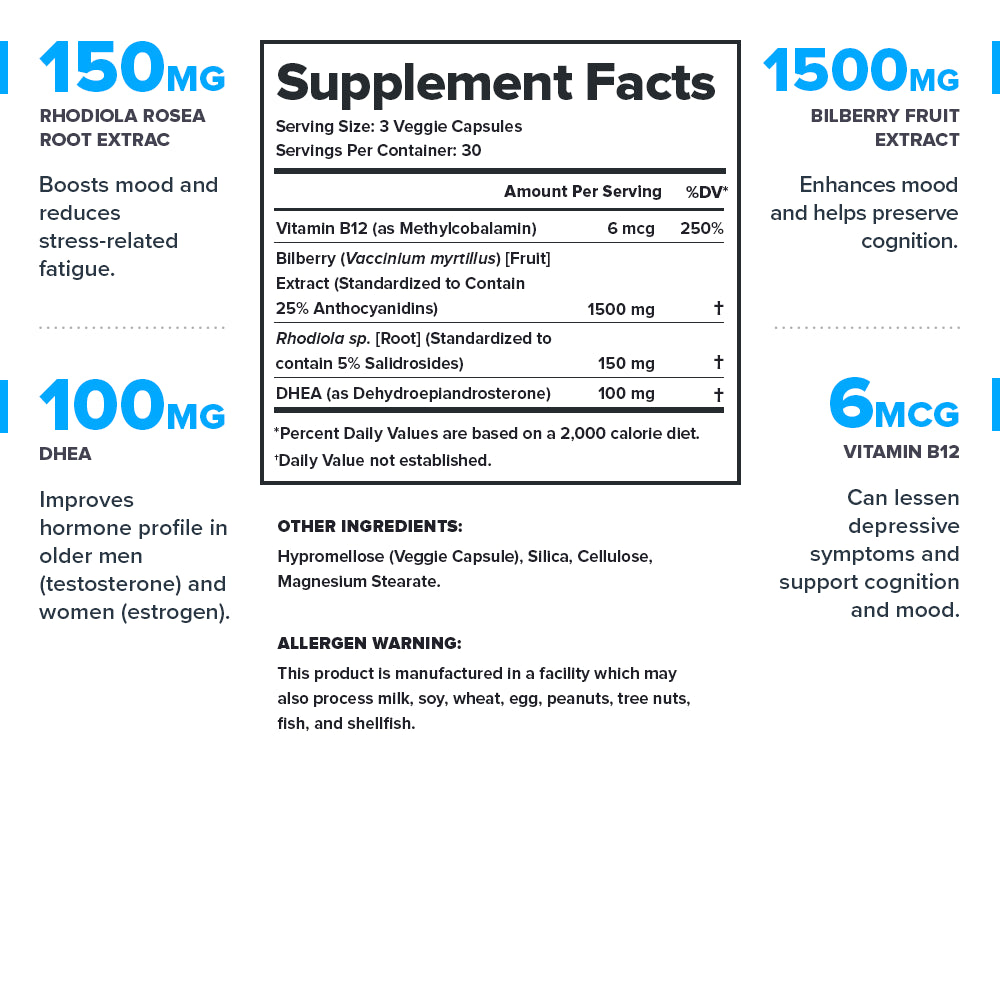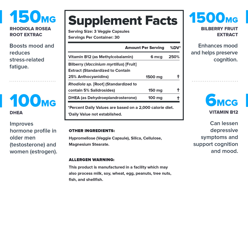 - BOOST MOOD & PRESERVE COGNITION. This mood enhancer contains two ingredients scientifically proven to support how you feel and how well you can think: bilberry extract and vitamin B12. Research also shows these ingredients can enhance cardiovascular health, reduce blood pressure, and alleviate depressive symptoms.