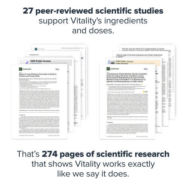 Vitality is a 100% natural wellness supplement that balances hormones, increases energy levels, and reduces stress and fatigue. - 27 peer-reviewed scientific studies support Vitality’s combination of ingredients and doses - Contains no artificial fillers, food dyes, or other chemical junk - Analyzed for purity and potency in a state-of-the-art ISO 17025 accredited lab - So order now, try Vitality risk free, and see for yourself why we believe it’s the perfect all-natural vitality supplement (that has sold over 10,000 bottles and counting!)