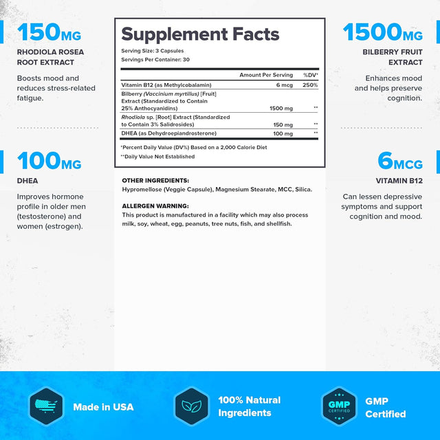 - HELPS MANAGE MOOD. This mood support contains two ingredients proven to providing support on how you feel and how well you can think: bilberry extract and vitamin B12.