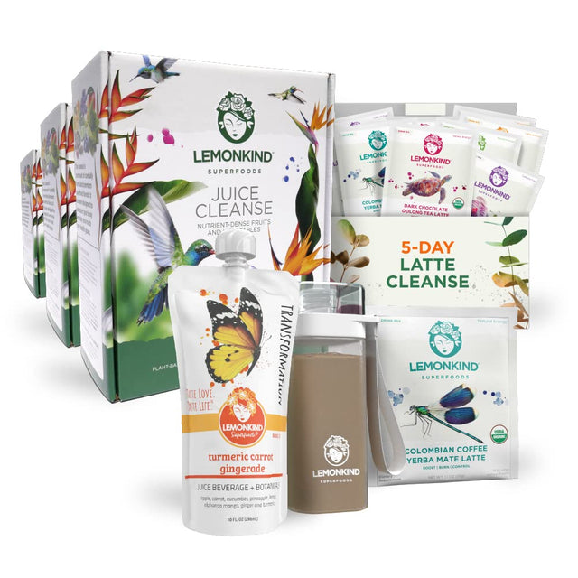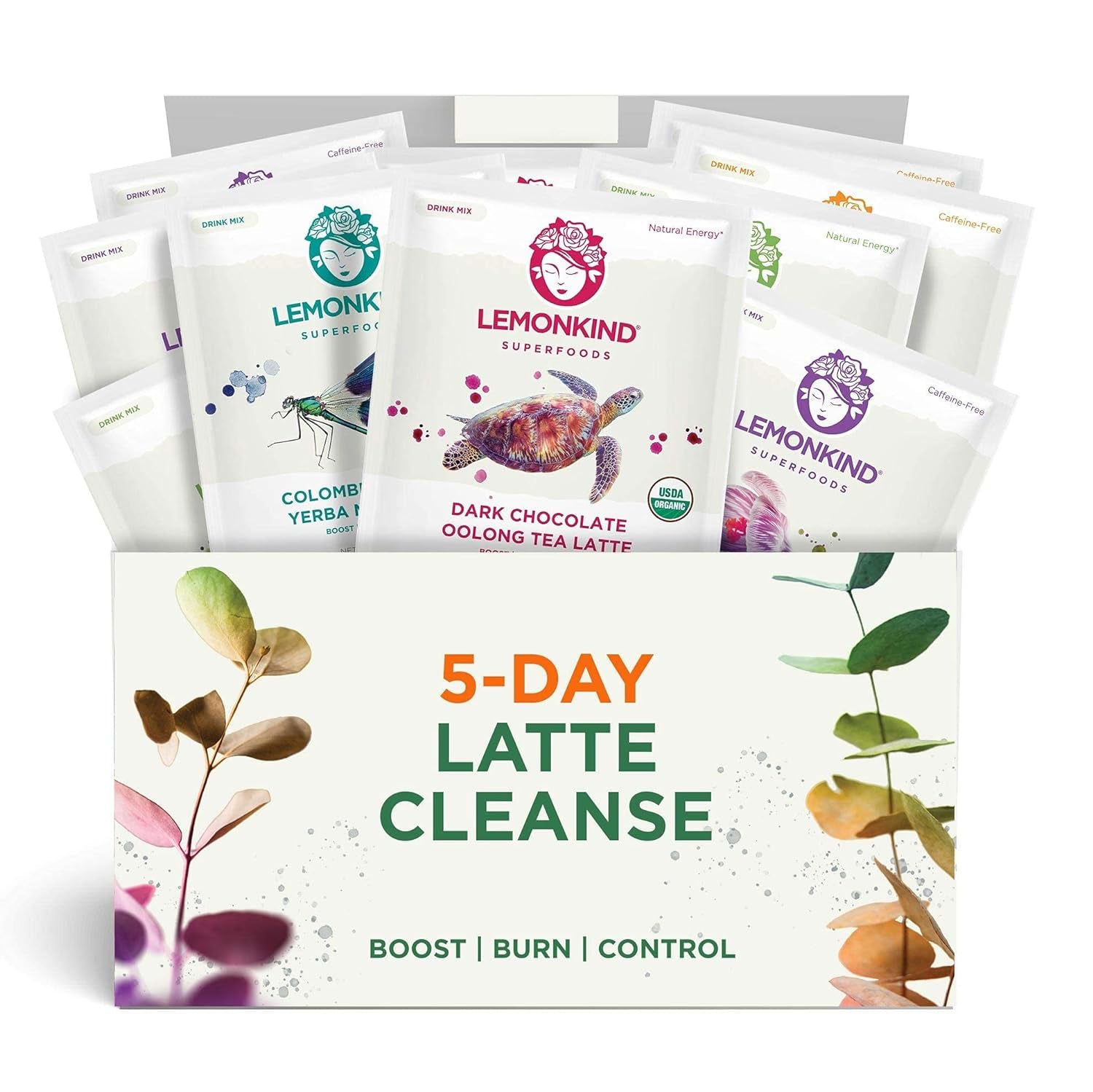 LEMONKIND 3 Day Core Detox Cleanse (24 Pack) to start then followed by our 5 Day ORGANIC Fat-burning Latte Cleanse (25 Sachets) for Healthy Weight Loss Jumpstart and Detox - Plant-Based Superfoods, Non-GMO & Gluten-Free Certified - 49 Servings + our custom awesome Tritan Bottle.
