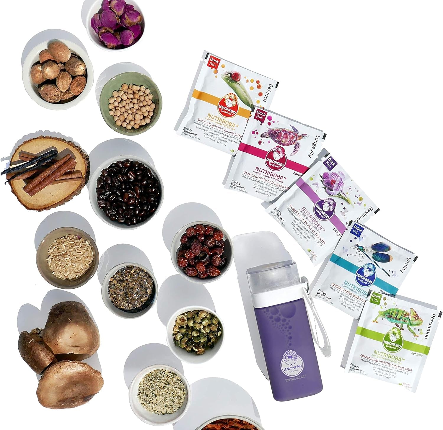 - Complete Organic Certified Vegan Protein Gluten-Free Meal Supplement Boxed Set of 25 sachets – Includes 5 Ceremonial Matcha Moringa Latte Sachets, 5 Arabica Coffee Yerba Matte Latte Sachets, 5 Dark Chocolate Oolong Tea Latte Sachets, 5 Golden Turmeric Vanilla Latte Sachets, and 5 Maqui Blueberry Dandelion Tea Latte Sachets.
