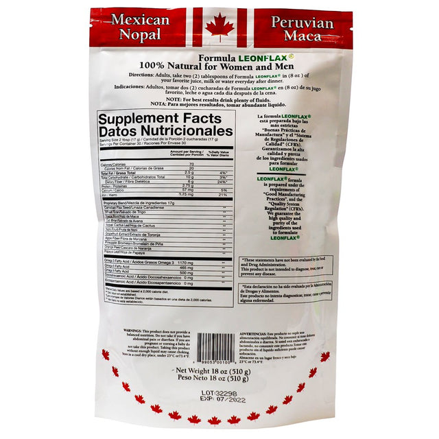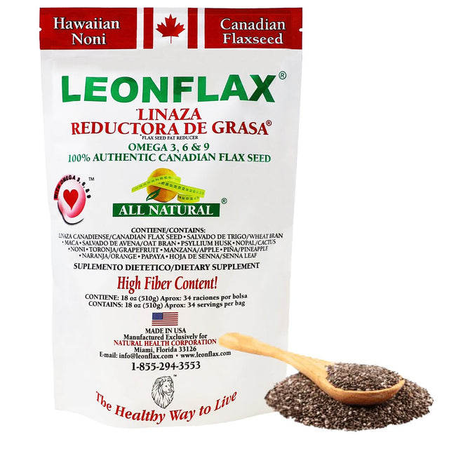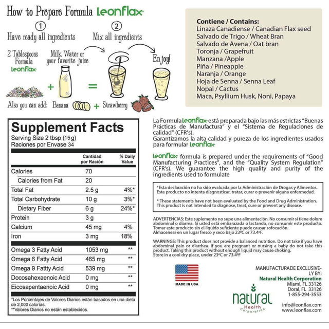 Leonflax Flax seed 100% Natural Formula. *Leonflax Dietary Supplement Formula has been prepared under the requirements of "Good Manufacturing Practices", and the "Quality System Regulation" (CFR's) *Relieve symptoms of constipation and regain your natural rhythm. *We guarantee the high quality and purity of the ingredients used to formulate Leonflax.*LeonFlax is the only formula that contains and combines 14 100% natural ingredients that act in the body without producing adverse side effects. Canadian Ground Flax seed, Whole Canadian Flax seed Wheat Bran / Oat Bran Maca / Nopal / Noni / Psyllium / Pineapple / Grapefruit Orange / Papaya / Apple / Senna Leaf. *This Dietary Supplement is not intended to diagnose, treat, cure or prevent any disease.* It is a super natural product and has no contraindications. It can be taken by anyone of any age. It is very healthy!