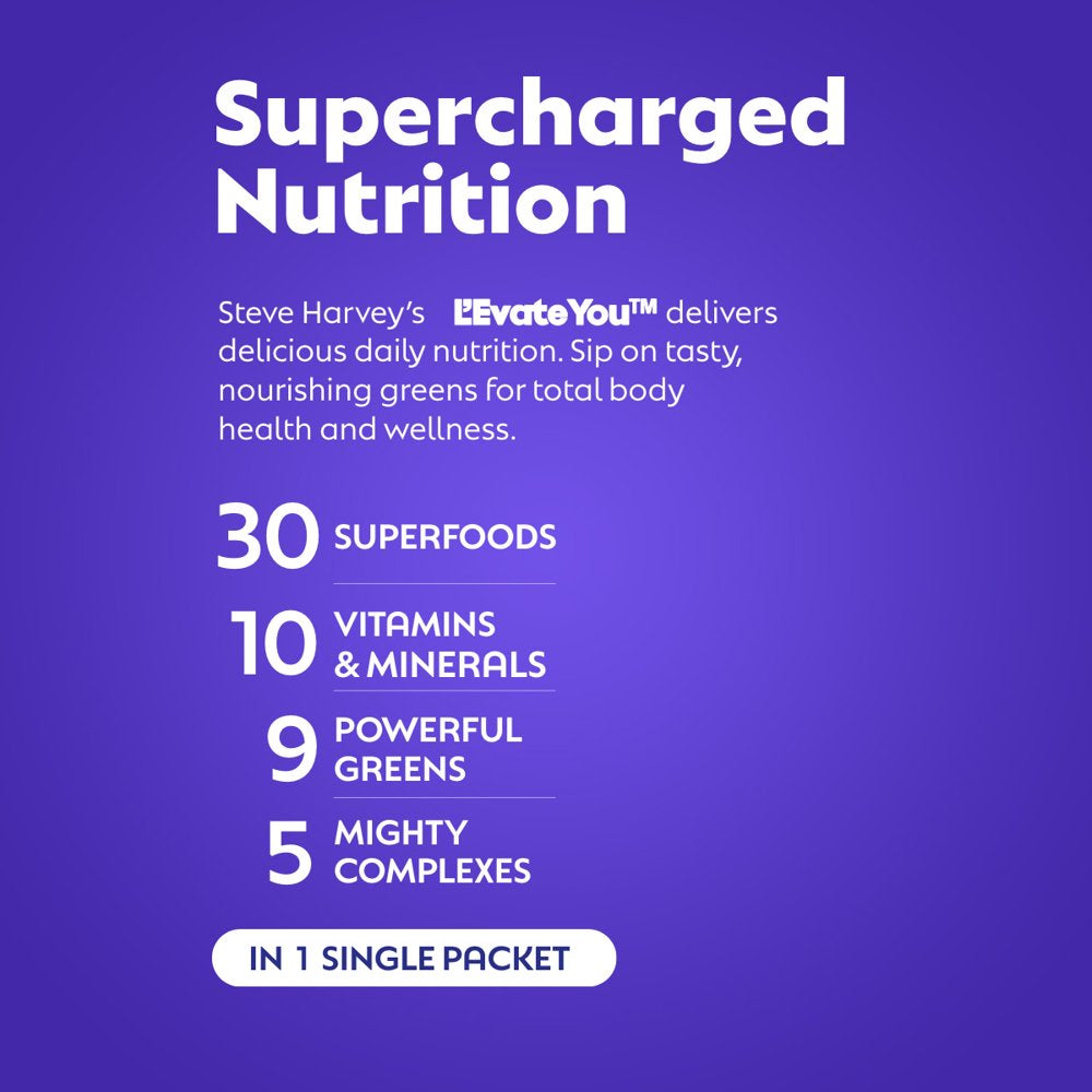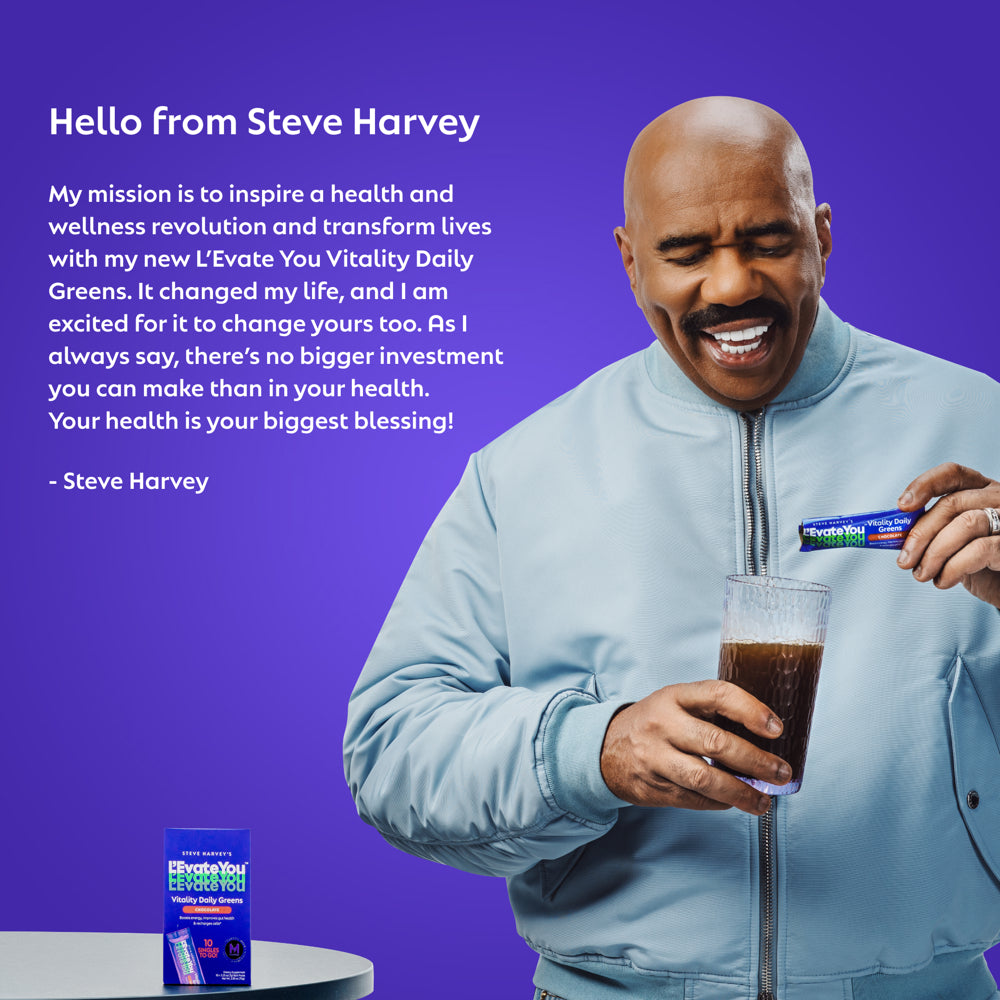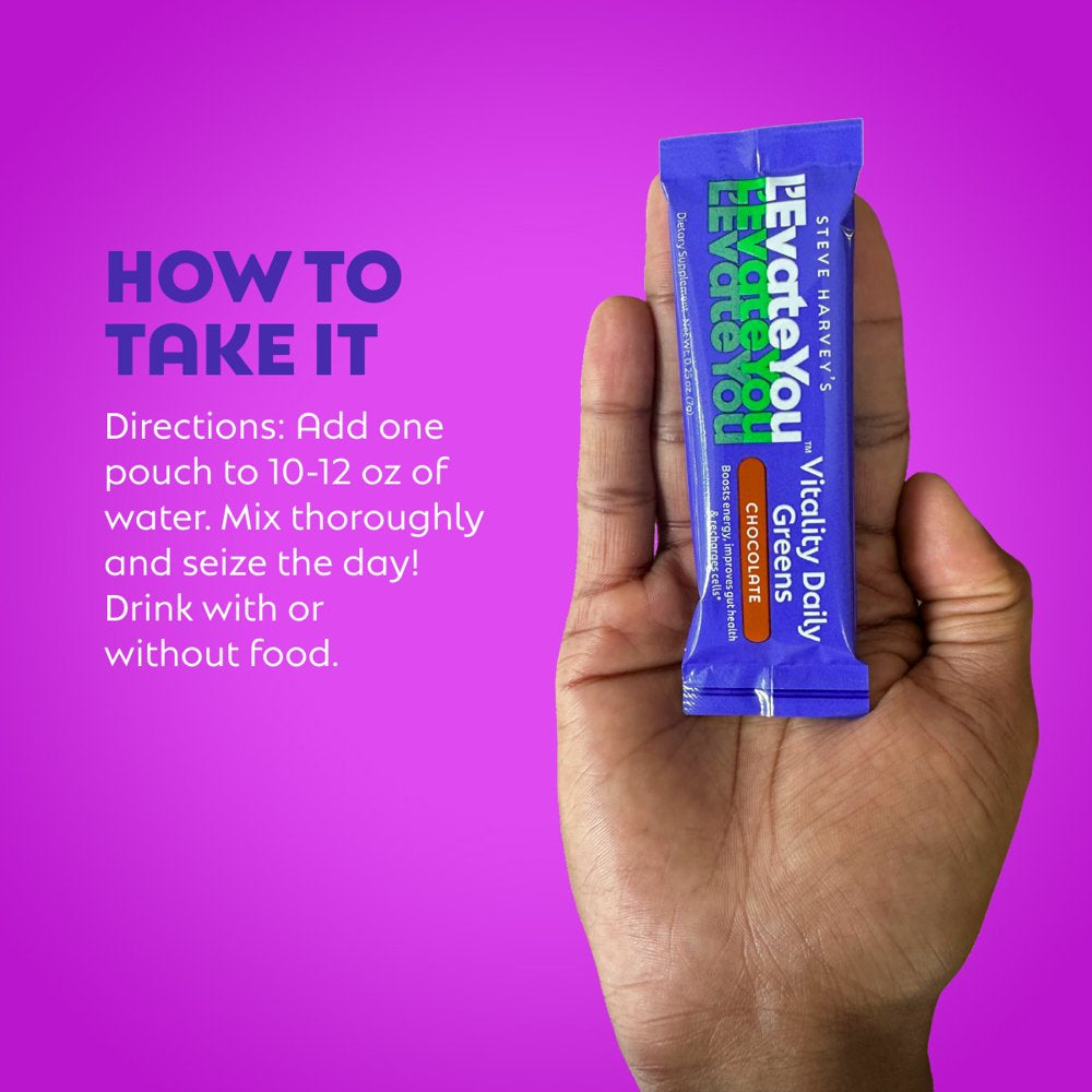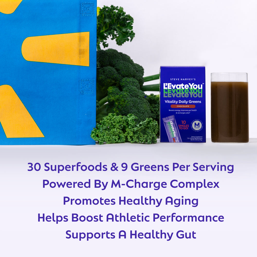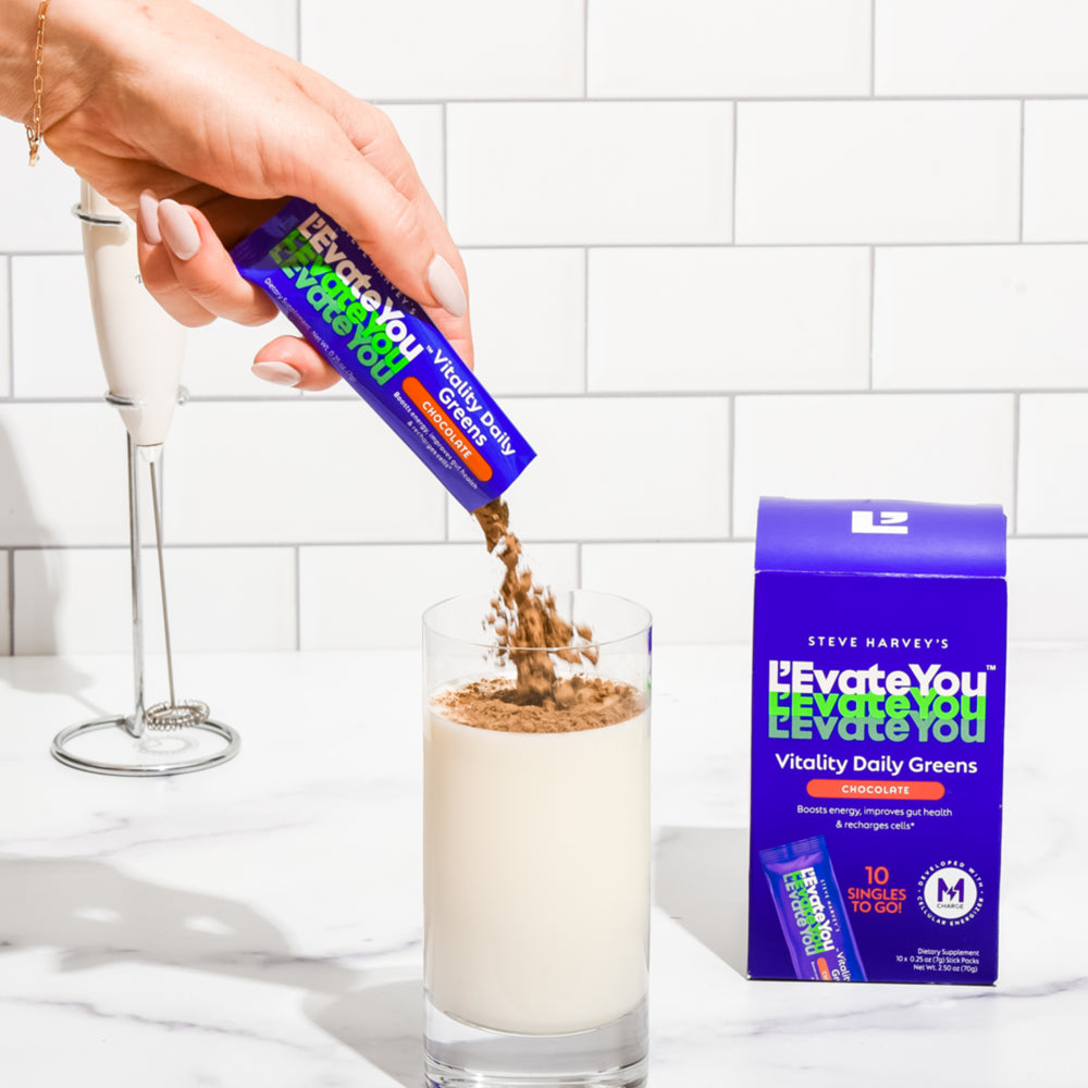 Steve Harvey’s Vitality Daily Greens in Chocolate delivers total body health and wellness. Each packet of this delicious daily dose of greens is powered by our one-of-a-kind M-Charge complex, a powerful cellular recharger. It helps support your body from life’s stressors, boosts energy, improves gut health, and promotes healthy aging. Experience more daily energy and numerous health benefits with this rich, smooth, chocolatey flavor. It’s so good, you almost mistake it for a milkshake!* *These statements have not been evaluated by the Food and Drug Administration. This product is not intended to diagnose, treat, cure or prevent any disease.