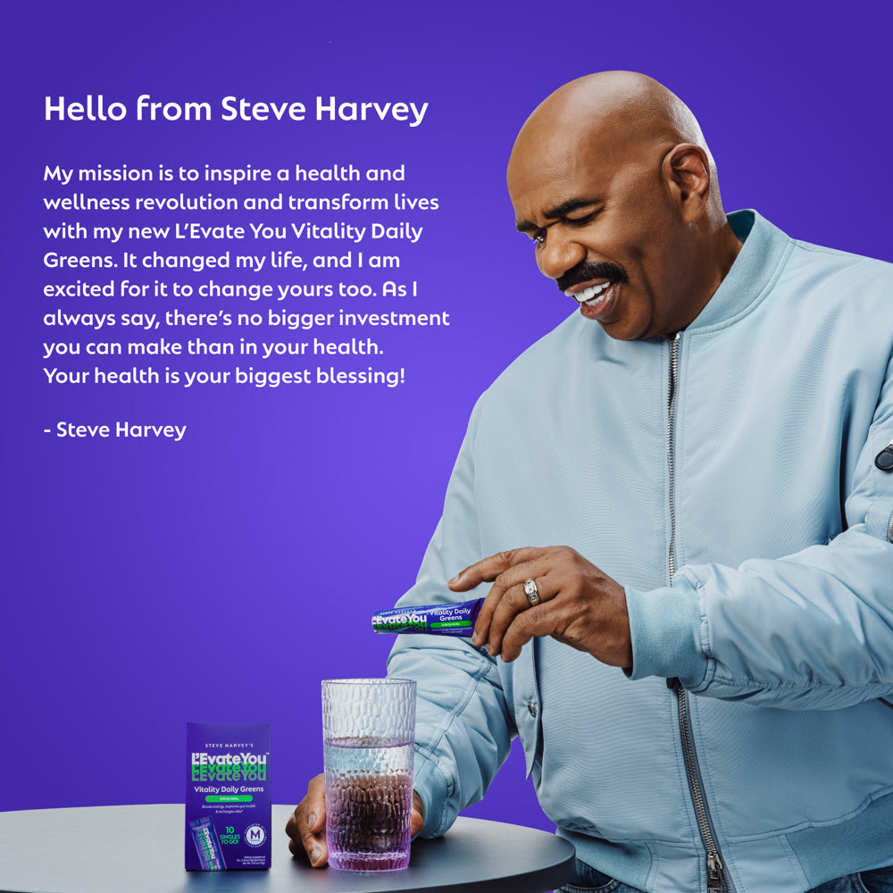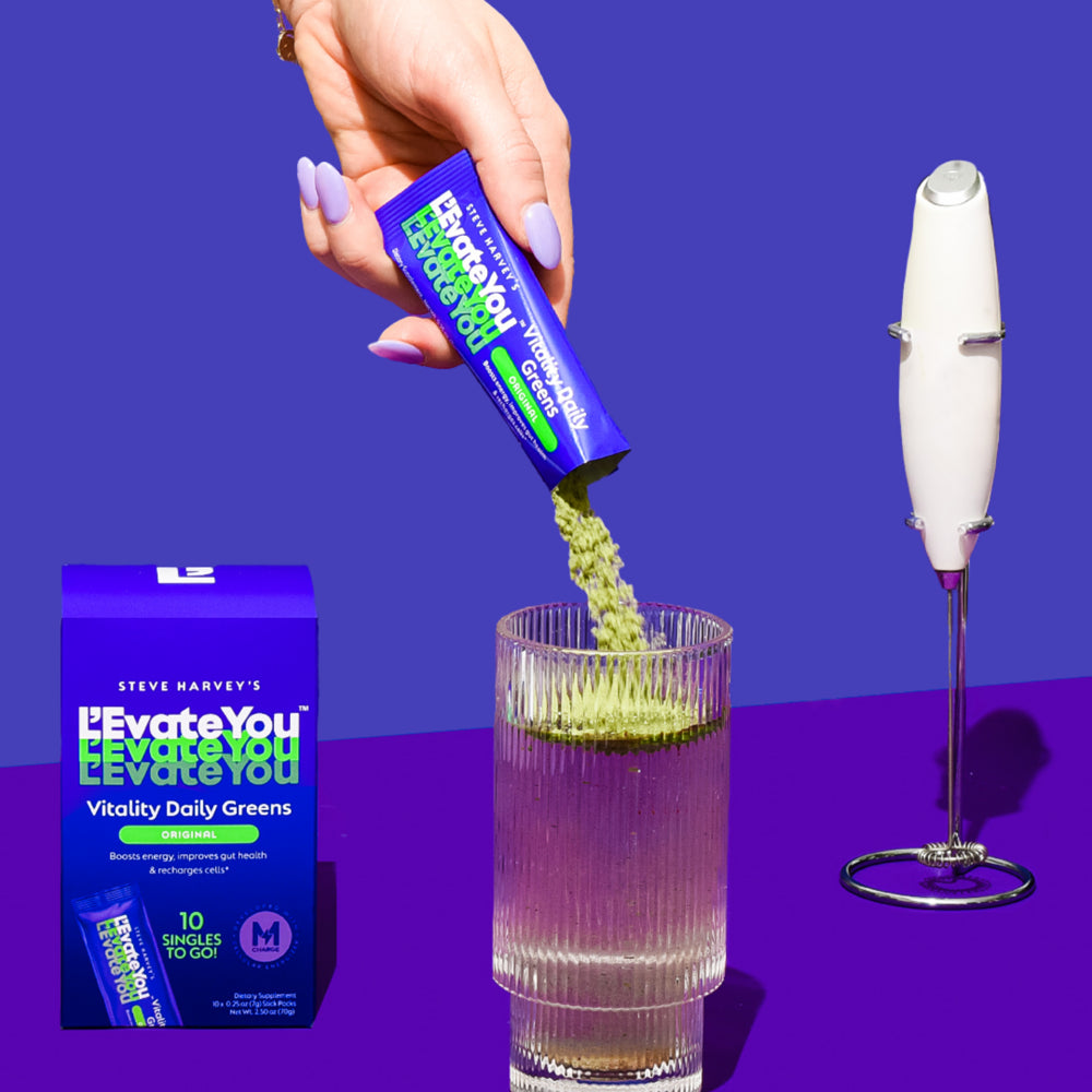 Steve Harvey’s Vitality Daily Greens in Original is your delicious daily dose of green for total body health and wellness. Each packet is packed with 30 superfoods, 5 powerful complexes, and 9 greens per serving and is powered by our one-of-a-kind M-Charge complex, a powerful cellular recharger. This helps support your body from life’s stressors, boosts energy, improves gut health, and recharges your cells. Enjoy every sip of this light, flavorful, refreshing flavor and experience more daily energy and its numerous health benefits.* *These statements have not been evaluated by the Food and Drug Administration. This product is not intended to diagnose, treat, cure or prevent any disease.
