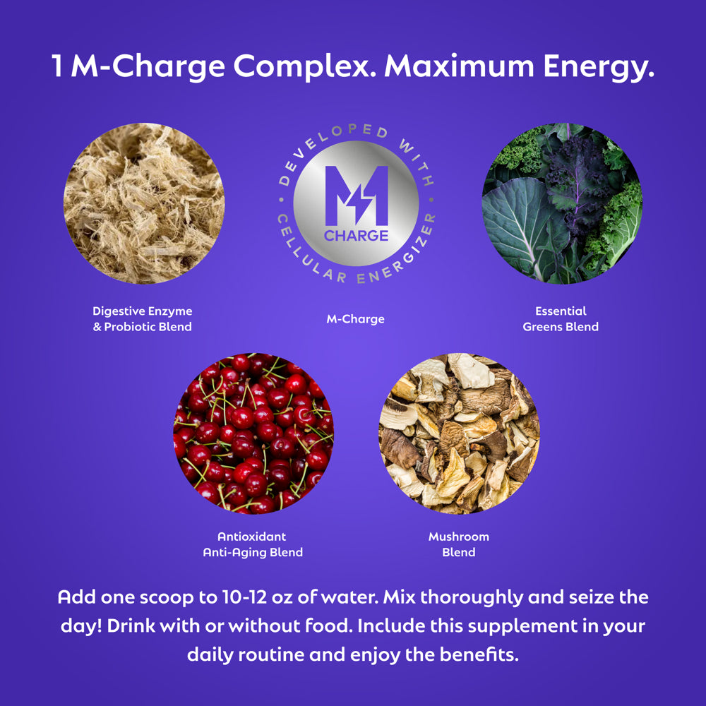 - 30 superfoods & 9 greens per serving; Powered by M-Charge complex to boost energy, improve gut health, and promote healthy aging; 5 powerful complexes for total body health