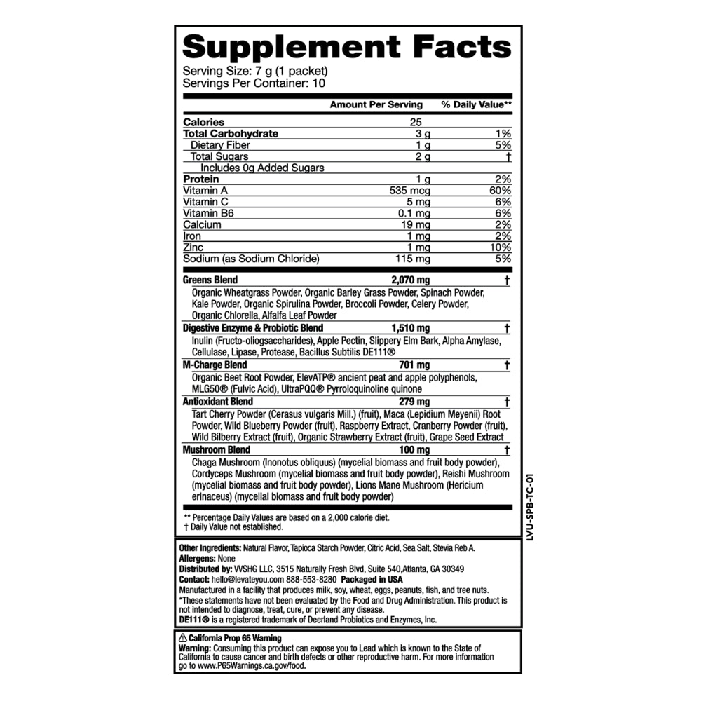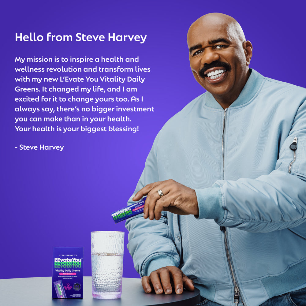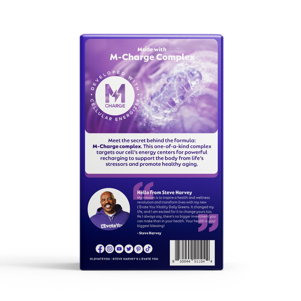 Steve Harvey's Vitality Daily Greens in Tart Cherry delivers delicious nutrition including 30 superfoods in just 30 seconds. Each packet is your daily dose of greens packed with natural superfoods, 5 powerful complexes, and 9 greens per serving for total body health and wellness. Vitality Daily Greens in Tart Cherry is powered by our one-of-a-kind M-Charge complex, a powerful cellular recharger, to help support your body from life’s stressors, boost energy, improve gut health, and recharge your cells. Experience more daily energy and numerous health benefits in a berry sweetness flavor with a hint of sour.* *These statements have not been evaluated by the Food and Drug Administration. This product is not intended to diagnose, treat, cure or prevent any disease.
