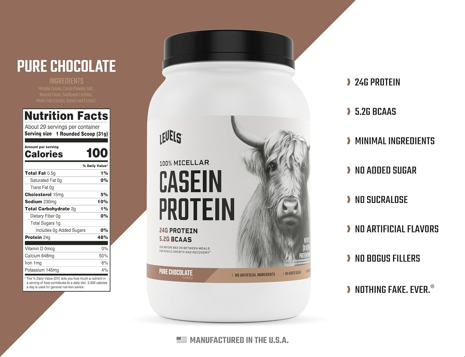 - SIMPLE & CLEAN: No fake chocolate flavor here. Levels Chocolate Casein is made with delicious cacao powder, natural flavor and lightly sweetened with monk fruit extract.