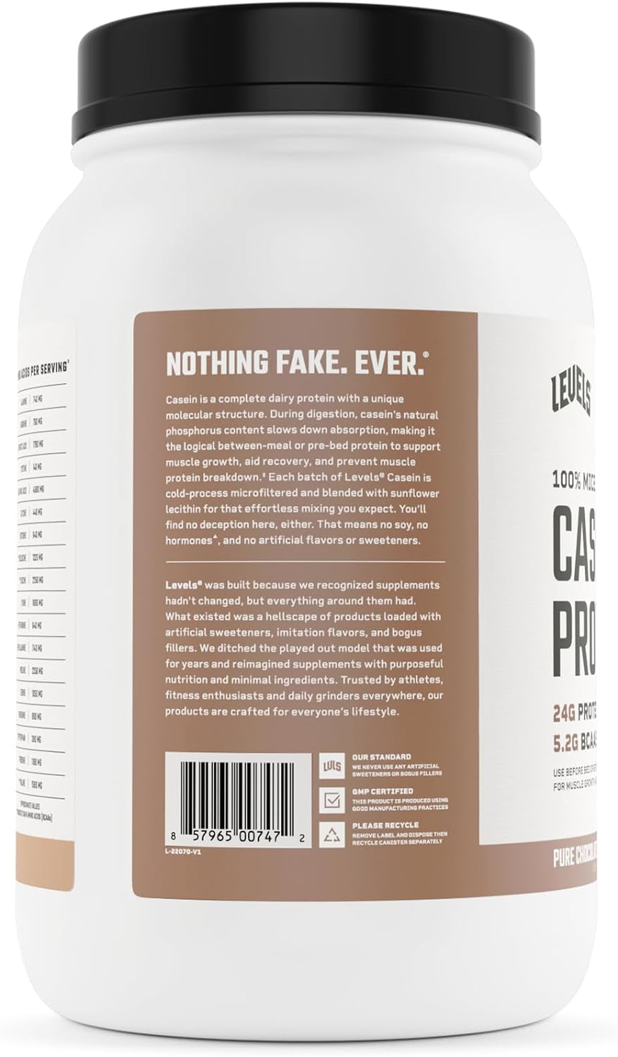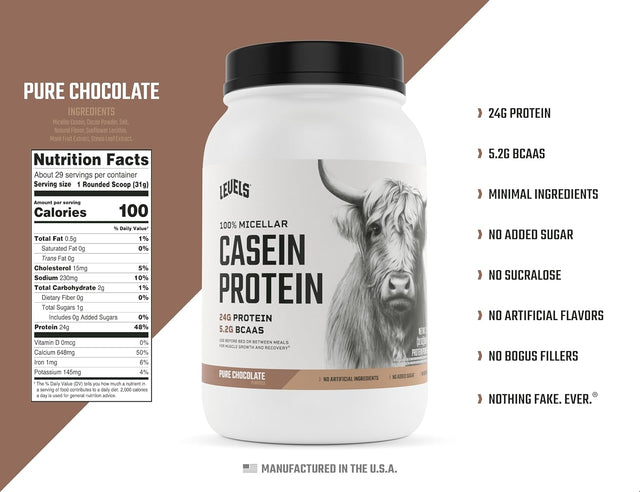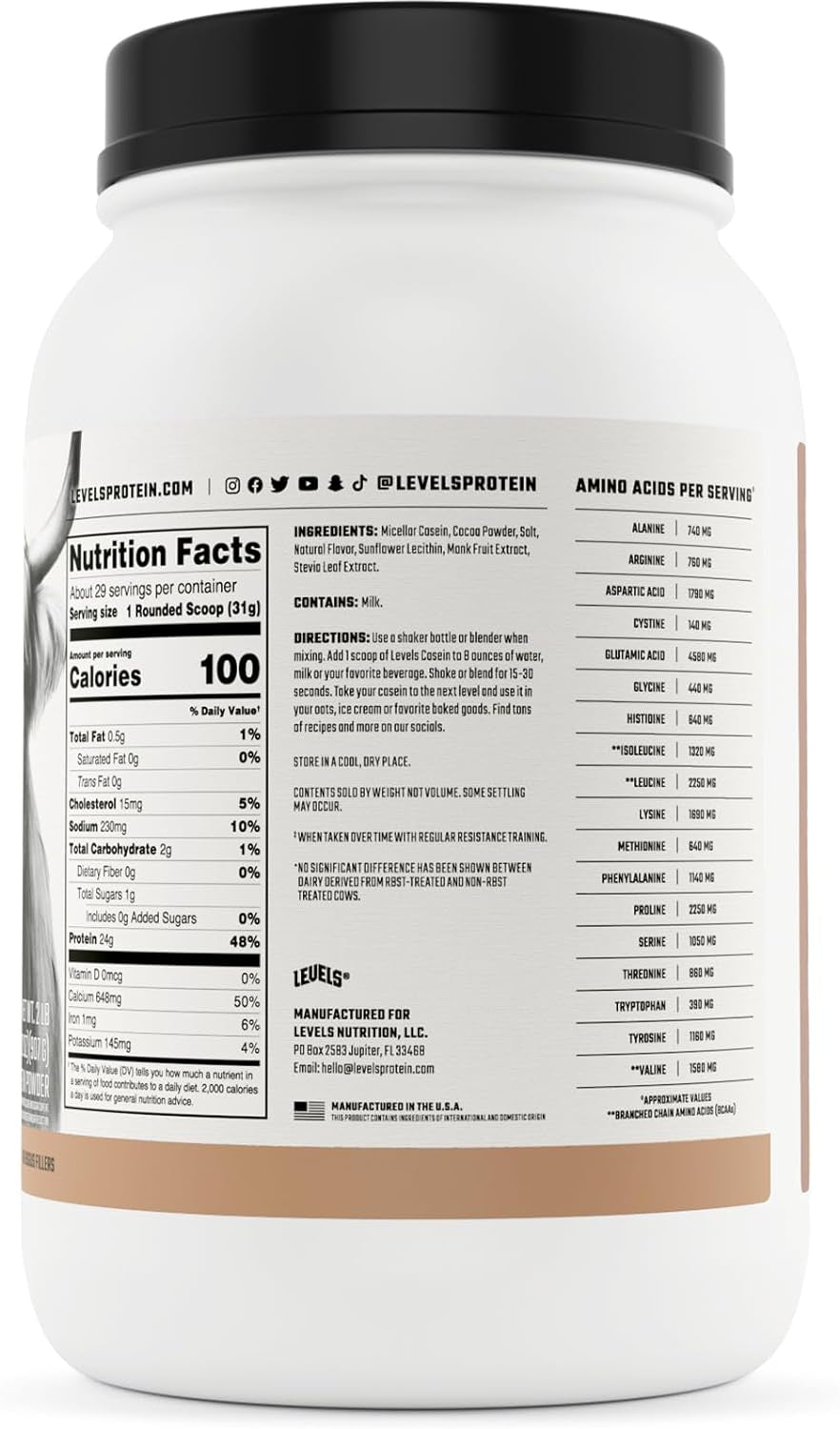 - LEVELS CASEIN PROTEIN: Each scoop of Levels Chocolate Casein contains 24g Protein, 5.2g BCAAs (branched-chain amino acids), and no added sugars. Trusted by athletes, fitness enthusiasts and daily grinders everywhere, our products are crafted for everyone’s lifestyle.