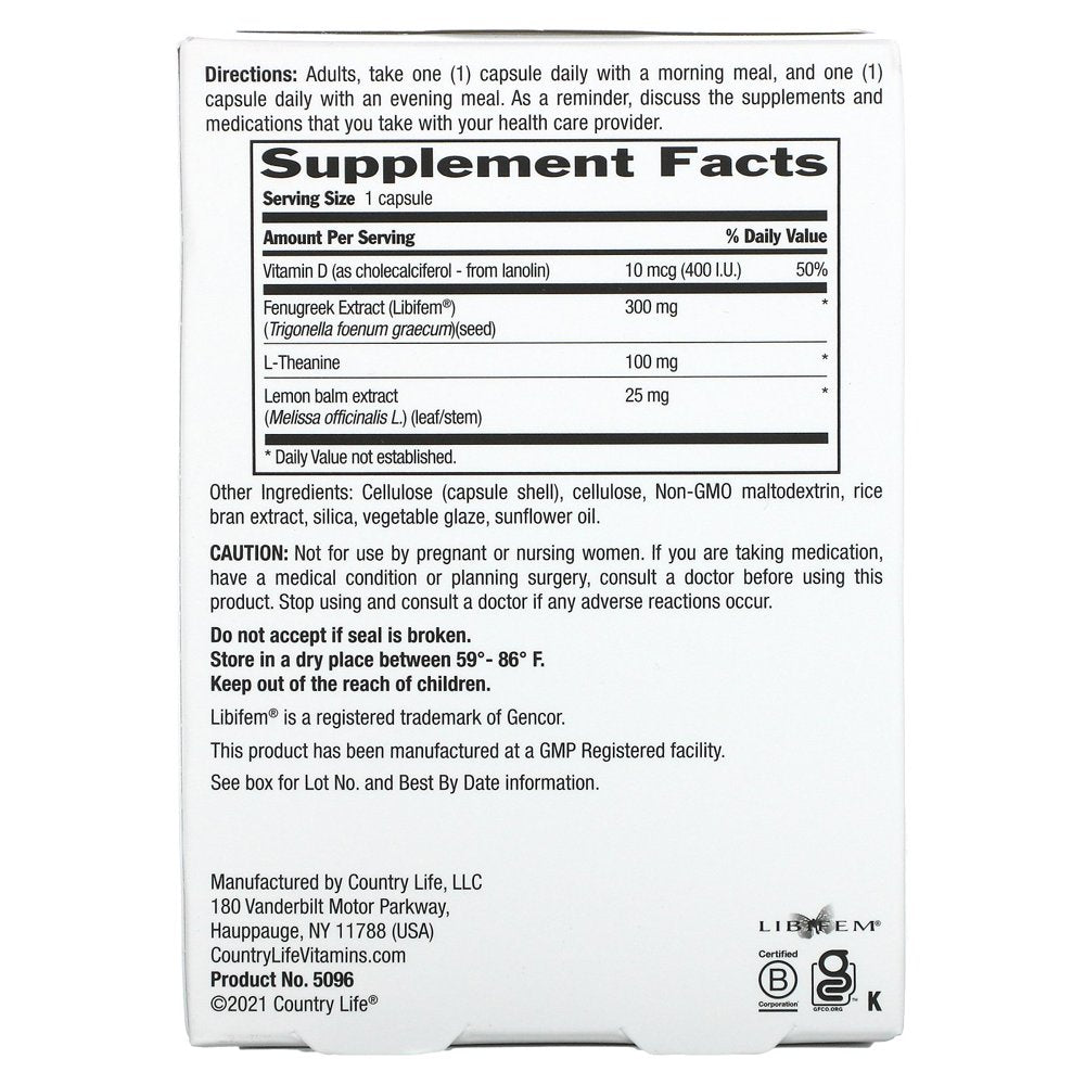 Maximum Female Sexual Health Formula With Clinically Tested Libifem® Plant Based Certified Gluten-Free Dietary Supplement Convenient Blister Packs Certified B Corporation Promotes: Arousal and desire Calm and relaxed mood Healthy hormonal levels — Our Pledge of Integrity — Authenticity Cleanliness Freshness Consistency Accuracy Healthy hormonal levels are critically important for maintaining energy, vitality, and vigor. Country Life’s Libido Rescue™ includes a clinically tested ingredient, Libifem® fenugreek seed extract, to support female sexual health and arousal. Relax and fuel your desire! Feel refreshed and ready to #poweryourgreatness™ YES Certified Gluten-Free by GFCO.org NO Yeast, Wheat or Soy YES Certified Vegetarian by the AVA NO Milk or Salt YES Kosher NO Preservatives NO Artificial Colors, Flavors or Sweeteners NO Magnesium Stearate NO GMOs Did you know? The ingredients in this libido formula support female sexual health. Libifem® is a clinically tested ingredient shown effective to promote: Female desire and arousal Female sexual health L-Theanine is a stress-fighting compound that: Relaxes the mind Promotes a calm and relaxed mood Gently soothes away tension Convenient portable blister packs!
